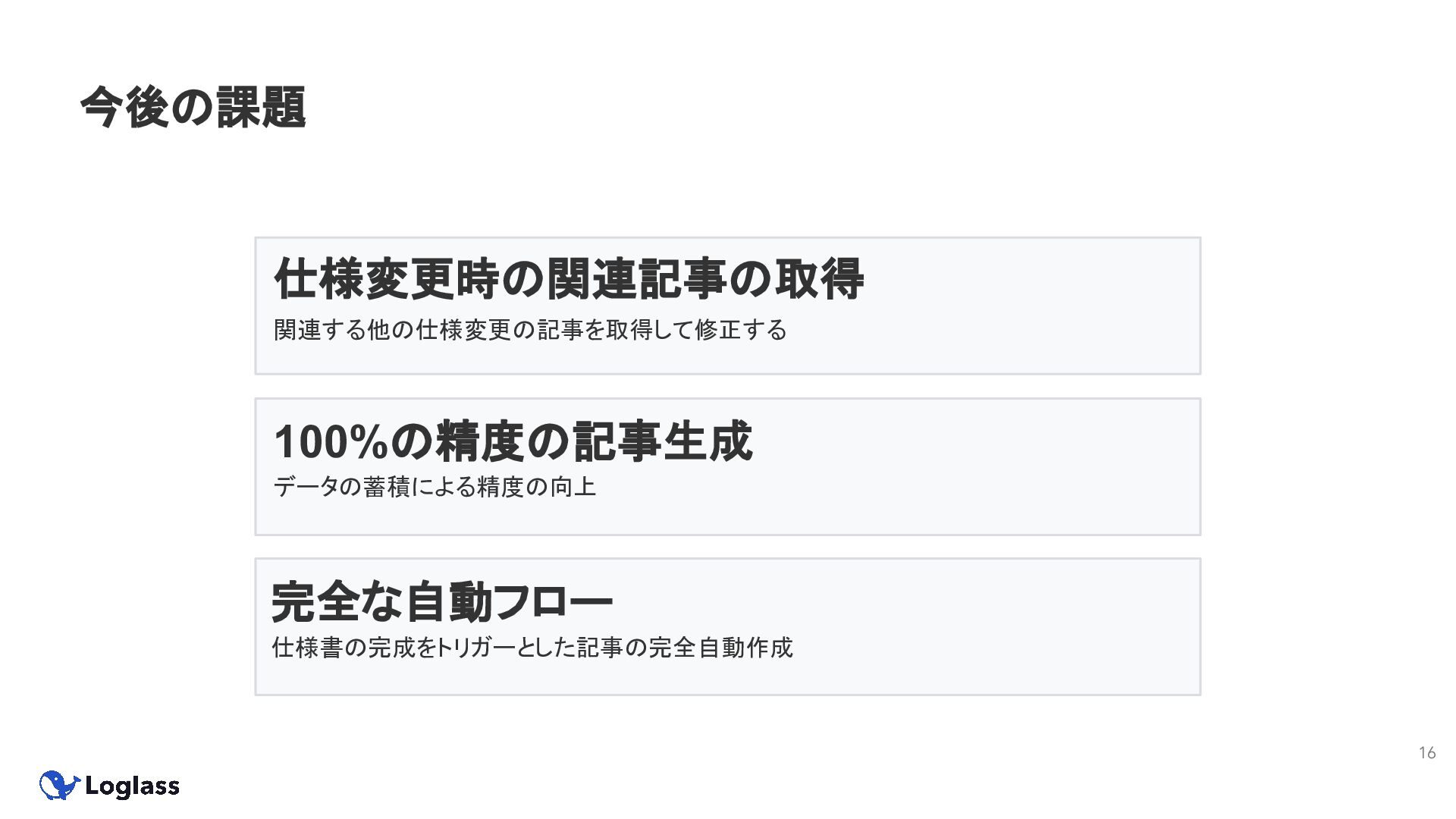 16 今後の課題 仕様変更時の関連記事の取得 関連する他の仕様変更の記事を取得して修正する 100%の精度の記事生成 データの蓄積による精度の向上 完全な自動フロー 仕様書の完成をトリガーとした記事の完全自動作成