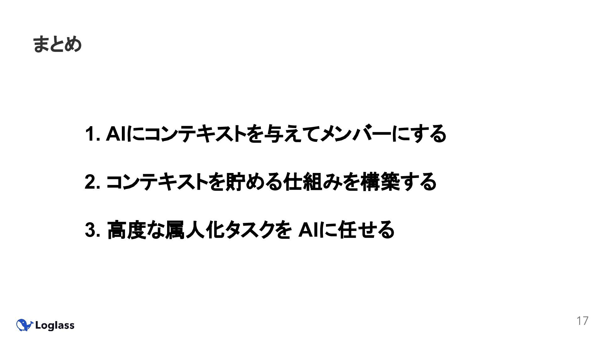 1. AIにコンテキストを与えてメンバーにする 2. コンテキストを貯める仕組みを構築する 3. 高度な属人化タスクを AIに任せる 17 まとめ