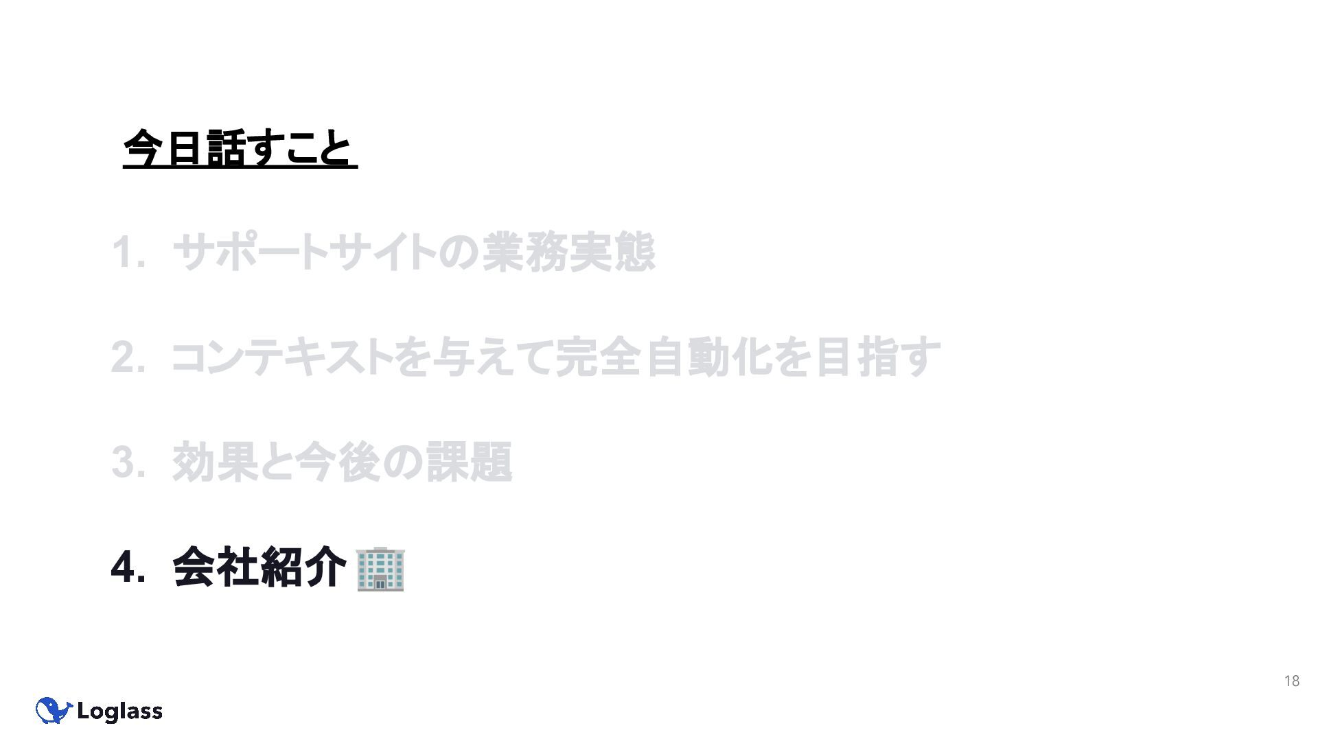 18 1. サポートサイトの業務実態 2. コンテキストを与えて完全自動化を目指す 3. 効果と今後の課題 4. 会社紹介🏢 今日話すこと