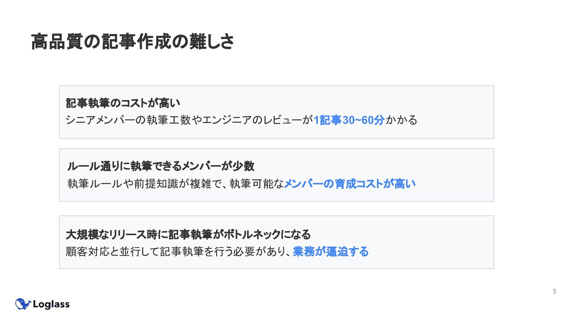 5 高品質の記事作成の難しさ ルール通りに執筆できるメンバーが少数 執筆ルールや前提知識が複雑で、執筆可能なメンバーの育成コストが高い 記事執筆のコストが高い シニアメンバーの執筆工数やエンジニアのレビューが1記事30~60分かかる 大規模なリリース時に記事執筆がボトルネックになる 顧客対応と並行して記事執筆を行う必要があり、業務が逼迫する