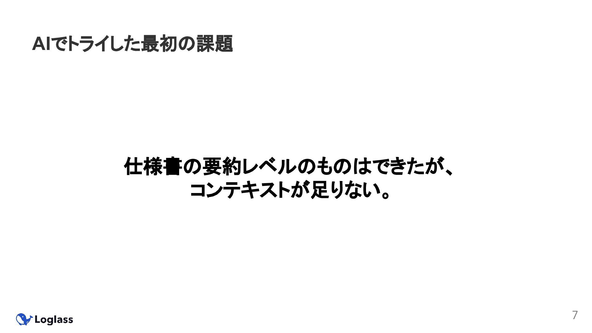 仕様書の要約レベルのものはできたが、 コンテキストが足りない。 7 AIでトライした最初の課題
