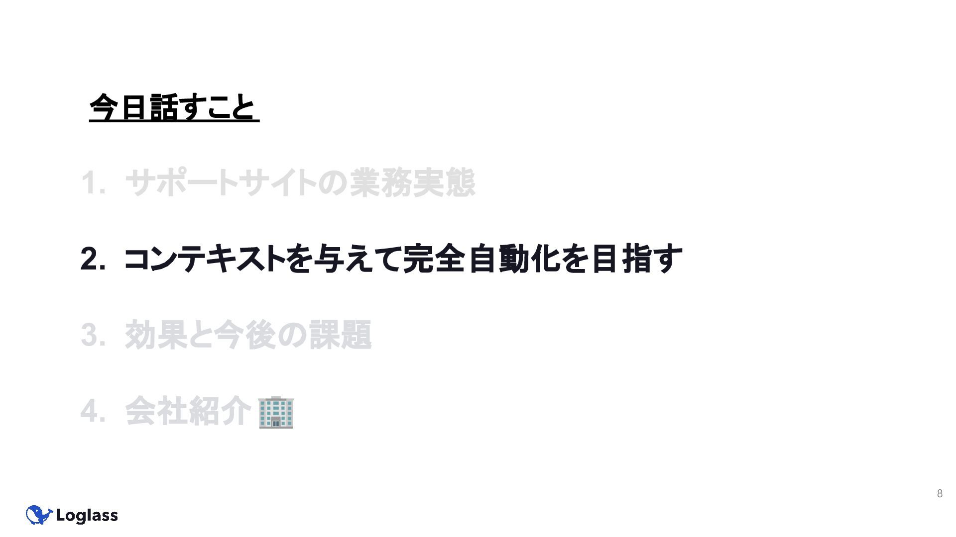 8 1. サポートサイトの業務実態 2. コンテキストを与えて完全自動化を目指す 3. 効果と今後の課題 4. 会社紹介🏢 今日話すこと