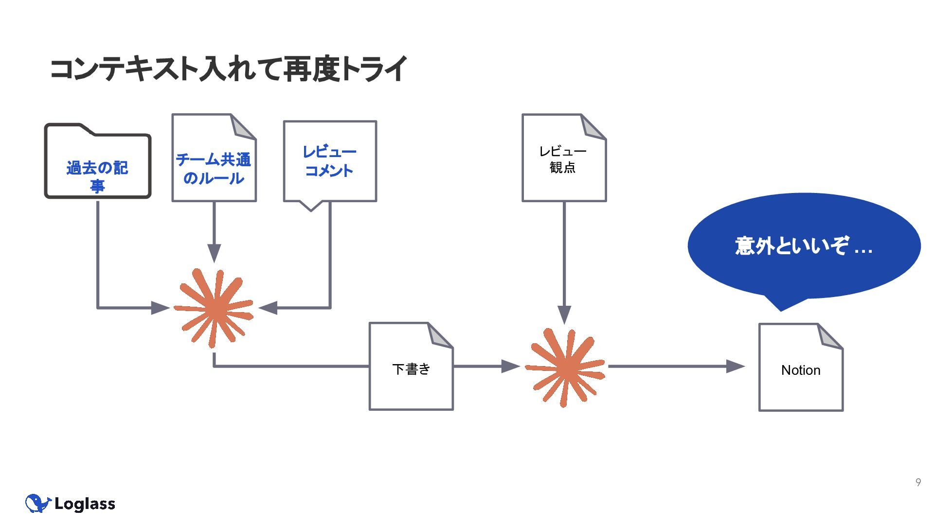 9 コンテキスト入れて再度トライ 過去の記 事 チーム共通 のルール レビュー コメント レビュー 観点