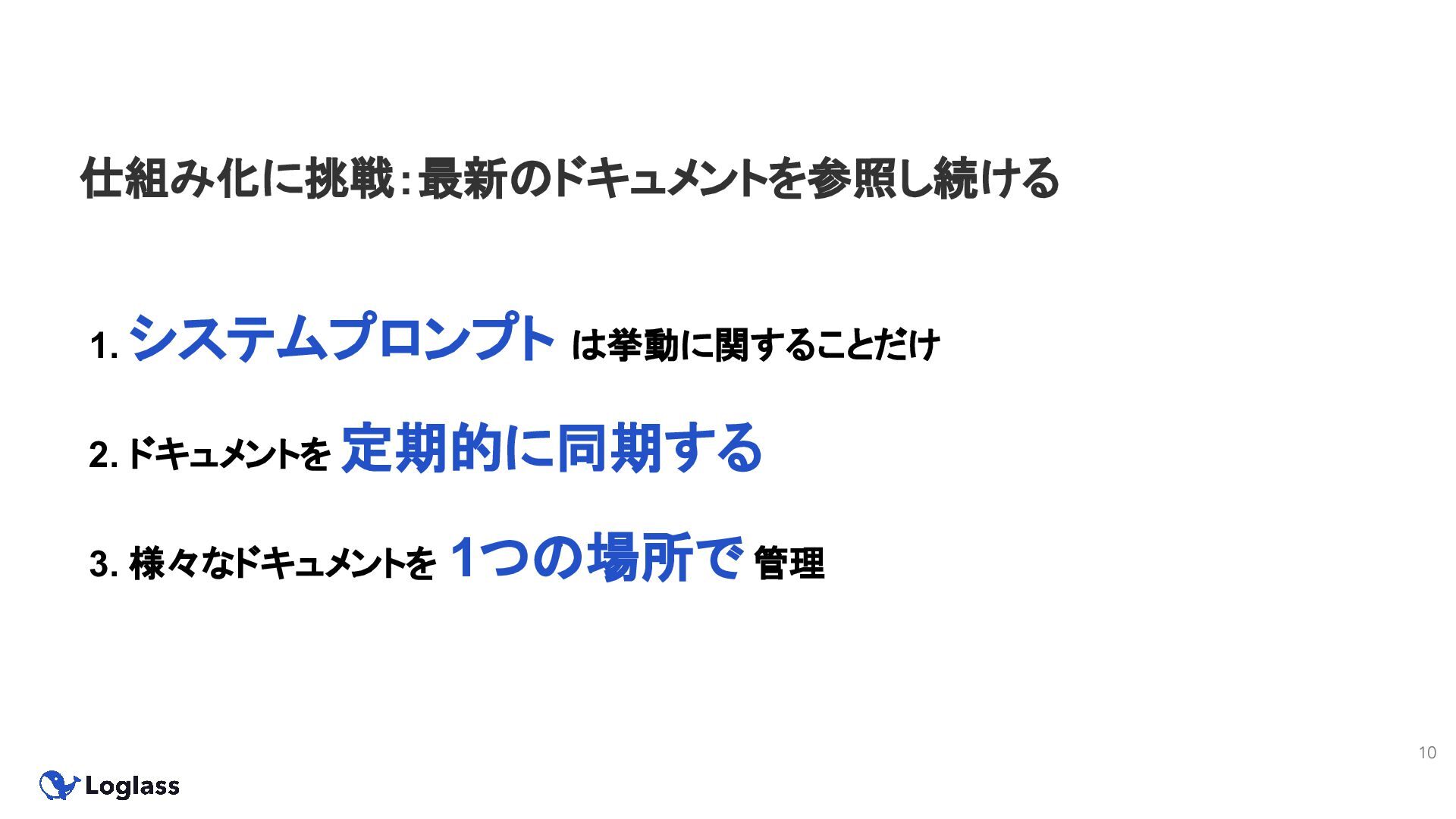 10 仕組み化に挑戦:最新のドキュメントを参照し続ける 1. システムプロンプト は挙動に関することだけ 2. ドキュメントを 定期的に同期する 3. 様々なドキュメントを