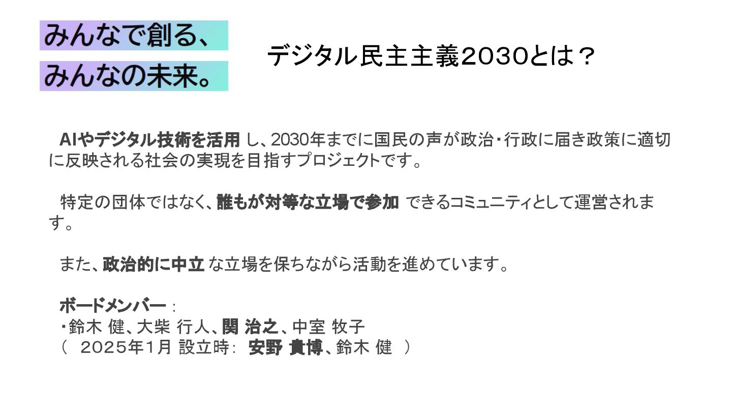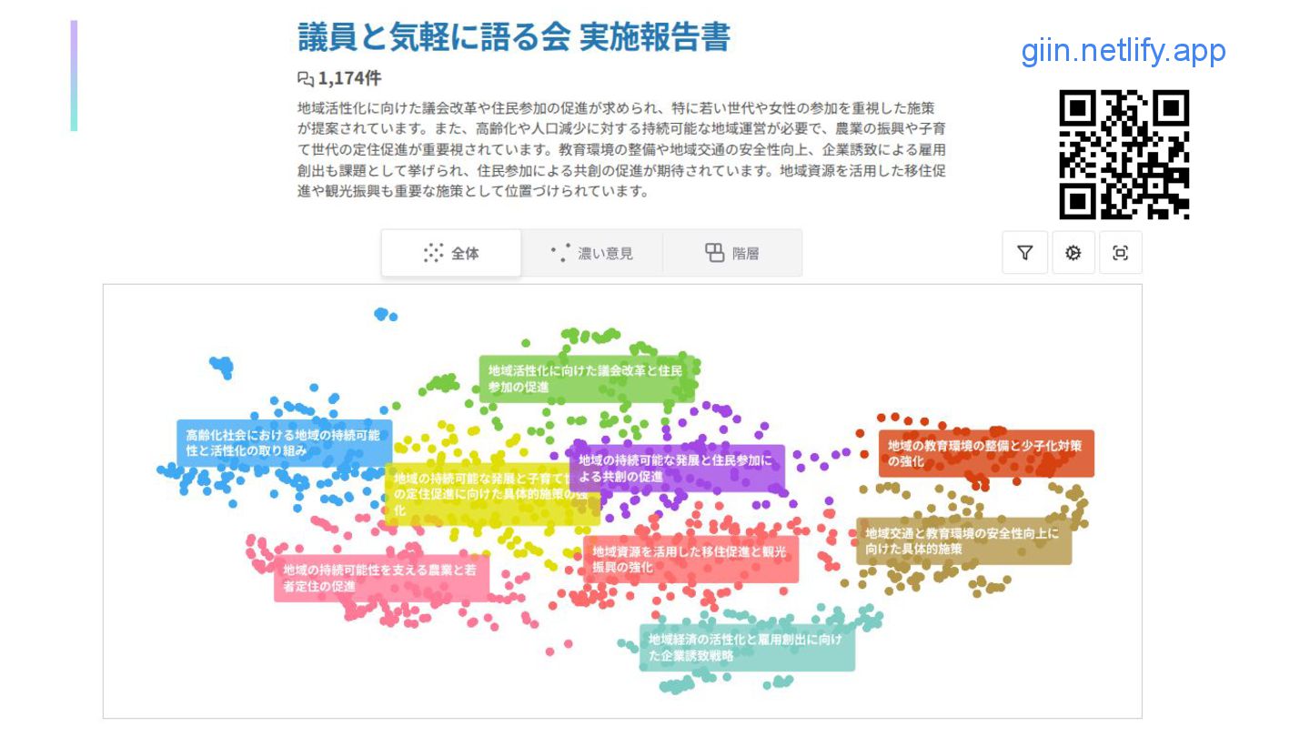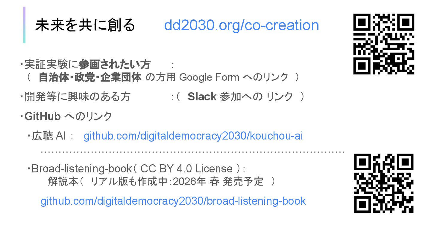 デジタル民主主義2030( dd2030.org )で開発した OSS ブロードリスニング・ツール( 広聴AI )の地方自治体での活用事例紹介。市内2中学の統合に際し、保護者や地域の方々の「地域意向調査」を教育委員会が実施。市のHPで市民に向け公開された報告書データを分かりやすく可視化。「デジタル民主主義2030」は、AIやデジタル技術を活用し、2030年までに国民の声が政治・行政に届き政策に適切に反映される社会の実現を目指すプロジェクトです。特定の団体ではなく、誰もが対等な立場で参加できるコミュニティとして運営されます。また、広聴AIは、「Talk to the City」を基に、都知事選等での活用を経て日本の実務向けに機能改善され、2025年にオープンソース公開されたものです。