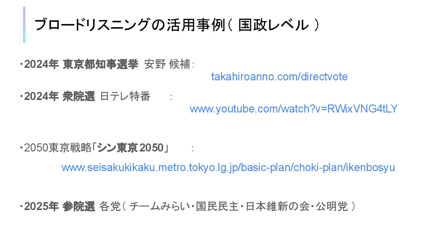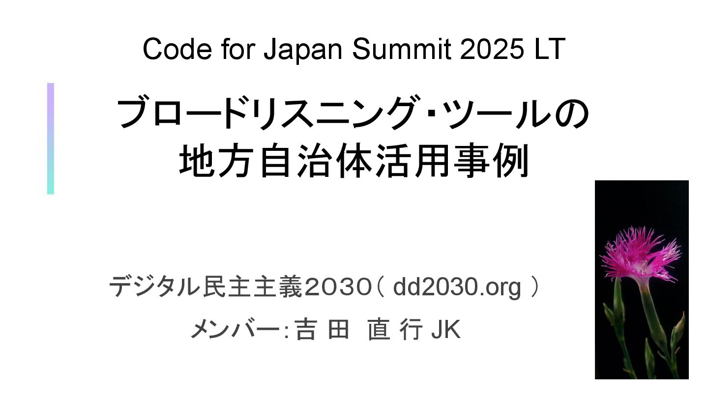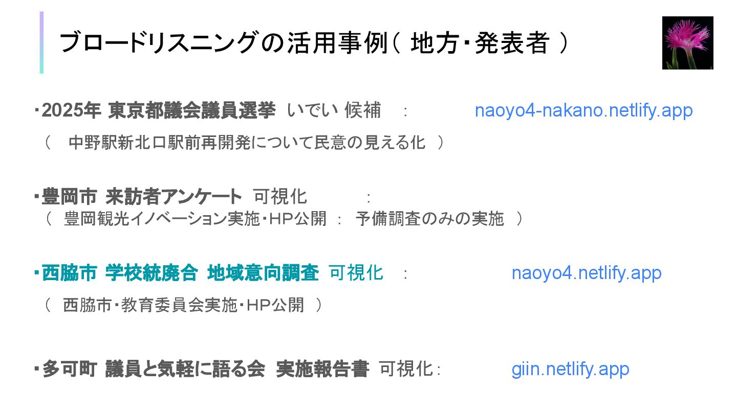 デジタル民主主義2030( dd2030.org )で開発した OSS ブロードリスニング・ツール( 広聴AI )の地方自治体での活用事例紹介。市内2中学の統合に際し、保護者や地域の方々の「地域意向調査」を教育委員会が実施。市のHPで市民に向け公開された報告書データを分かりやすく可視化。「デジタル民主主義2030」は、AIやデジタル技術を活用し、2030年までに国民の声が政治・行政に届き政策に適切に反映される社会の実現を目指すプロジェクトです。特定の団体ではなく、誰もが対等な立場で参加できるコミュニティとして運営されます。また、広聴AIは、「Talk to the City」を基に、都知事選等での活用を経て日本の実務向けに機能改善され、2025年にオープンソース公開されたものです。