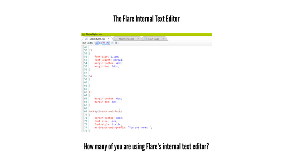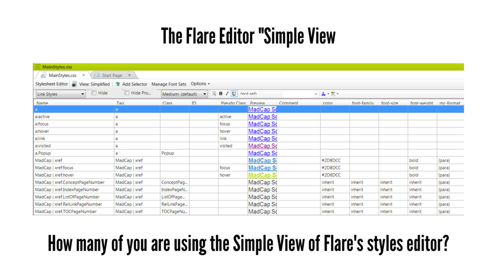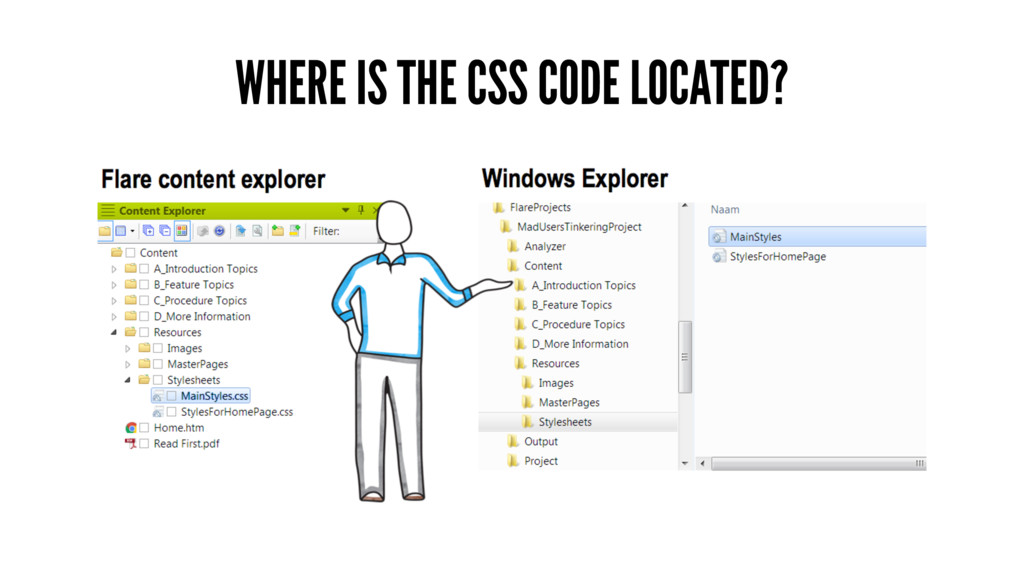 This MadUsers 2016 workshop will take you outside of the comfort zone that is the Flare Stylesheet Editor. Using your favourite text editor, we together will explore and manipulate the CSS file(s) that come with your typical Flare project. This will not only improve your understanding of CSS and Flare in general, but will also unlock a myriad of new styling possibilities for you to explore in your own projects. During the workshop you’ll learn to style elements like x-refs, drop-downs and tables using nothing more than a text editor