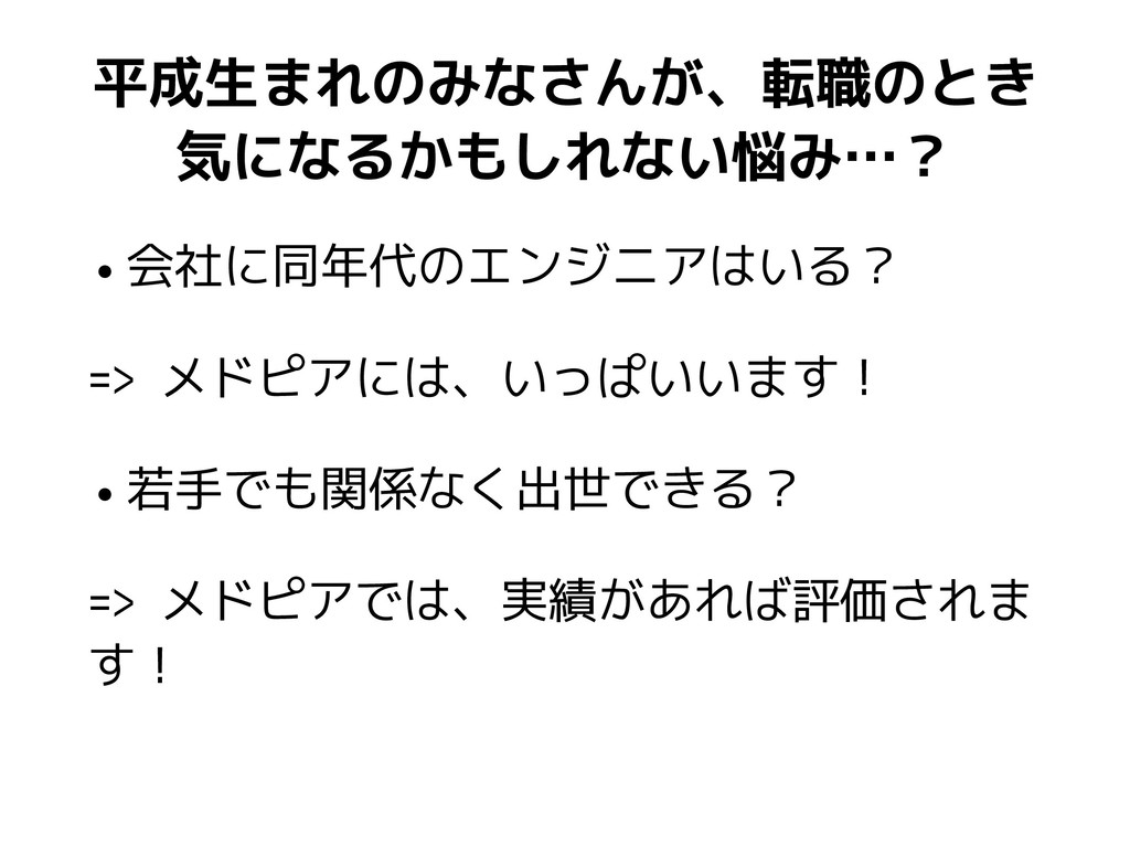 平成生まれのみなさんが、転職のとき 気になるかもしれない悩み…? •会社に同年代のエンジニアはいる? => メドピアには、いっぱいいます! •若手でも関係なく出世できる? => メドピアでは、実績があれば評価されま す!