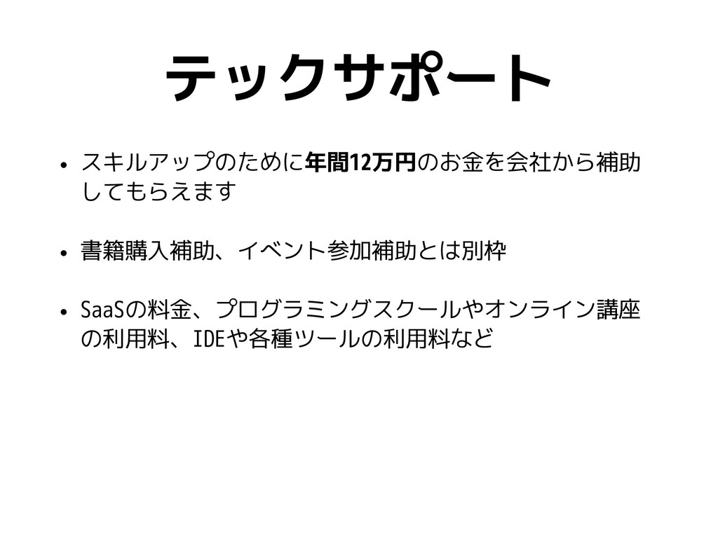 テックサポート • スキルアップのために年間12万円のお金を会社から補助 してもらえます • 書籍購入補助、イベント参加補助とは別枠 • SaaSの料金、プログラミングスクールやオンライン講座 の利用料、IDEや各種ツールの利用料など