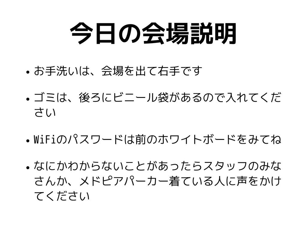 今日の会場説明 •お手洗いは、会場を出て右手です •ゴミは、後ろにビニール袋があるので入れてくだ さい •WiFiのパスワードは前のホワイトボードをみてね •なにかわからないことがあったらスタッフのみな さんか、メドピアパーカー着ている人に声をかけ てください