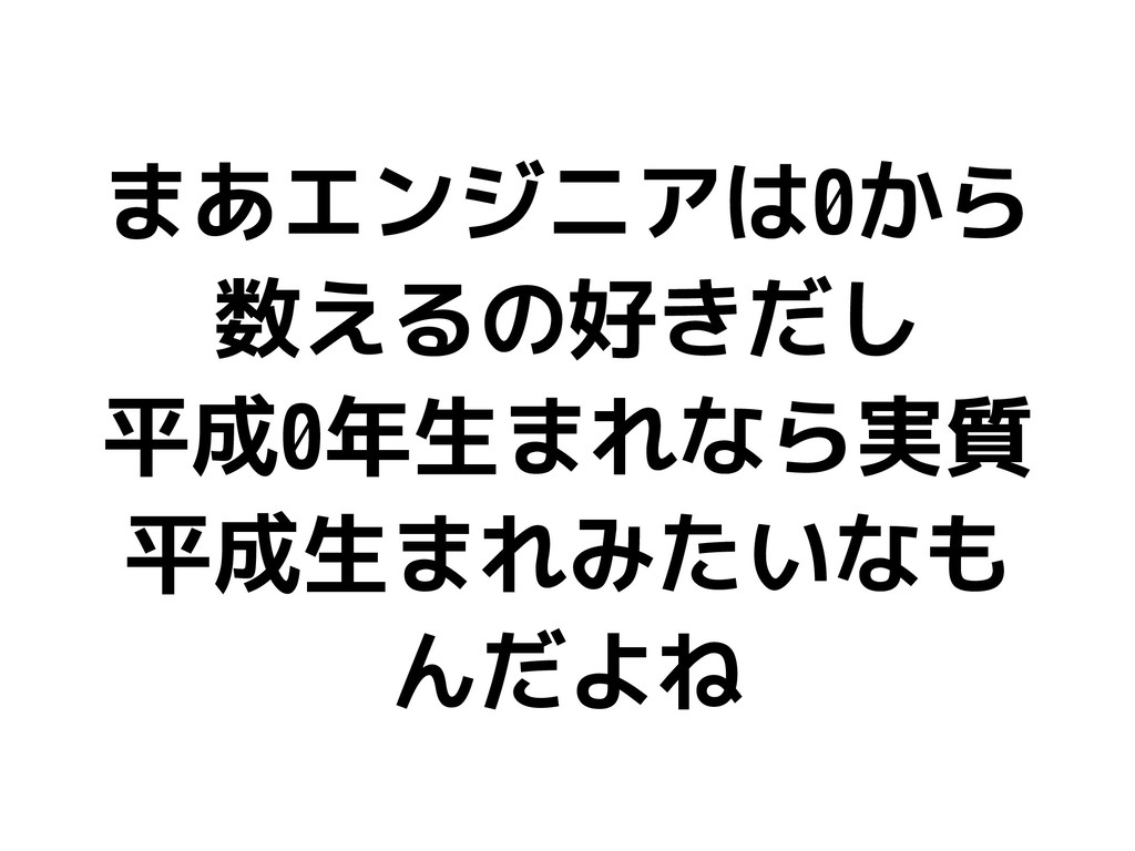 まあエンジニアは0から 数えるの好きだし 平成0年生まれなら実質 平成生まれみたいなも んだよね