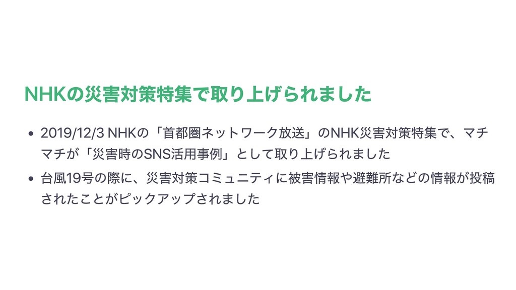 NHKの災害対策特集で取り上げられました 2019/12/3 NHKの「⾸都圏ネットワーク放送」のNHK災害対策特集で、マチ マチが「災害時のSNS活⽤事例」として取り上げられました 台⾵19号の際に、災害対策コミュニティに被害情報や避難所などの情報が投稿 されたことがピックアップされました