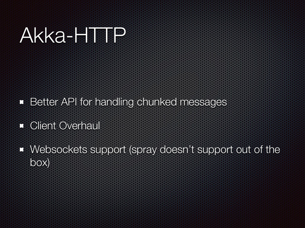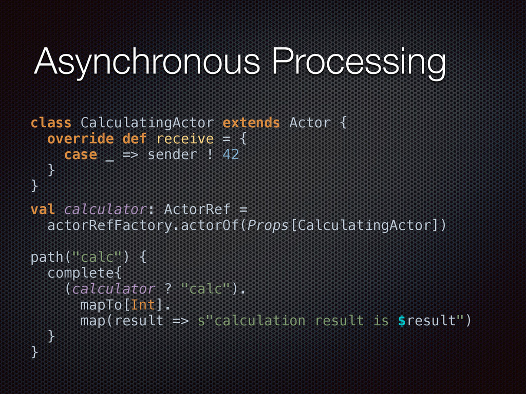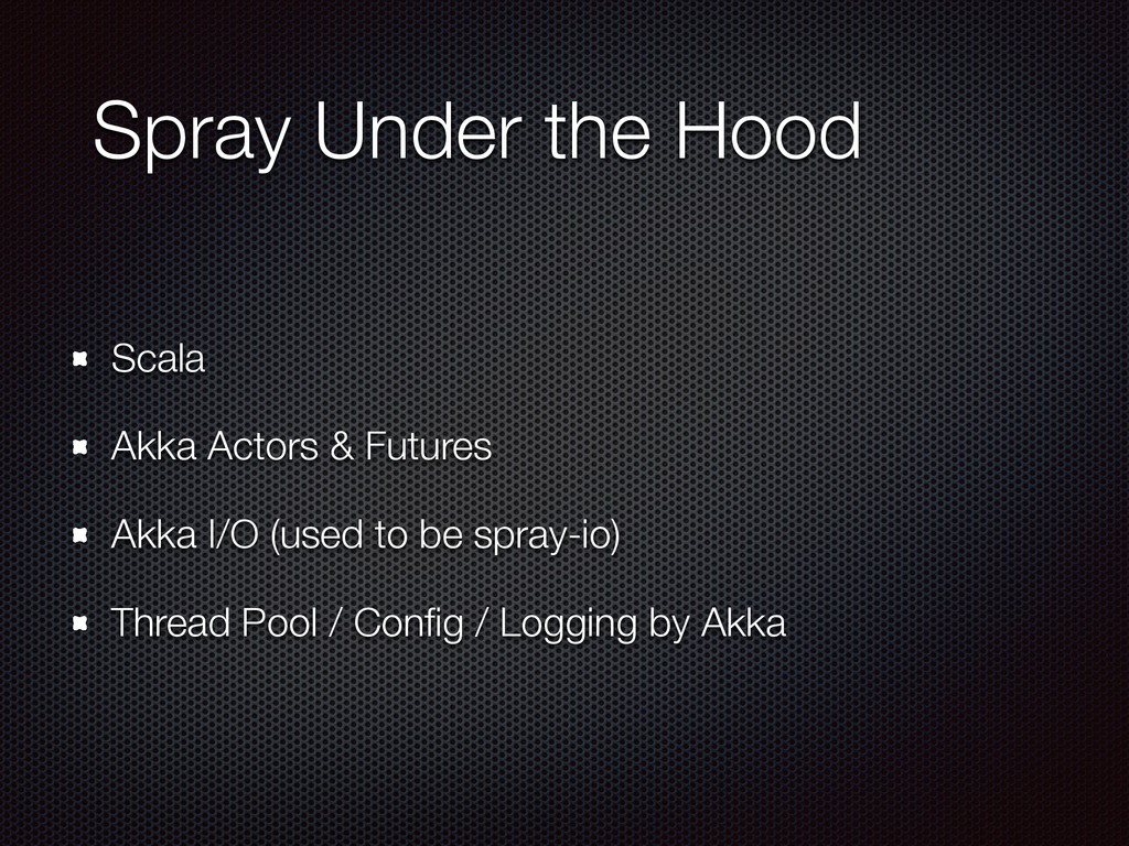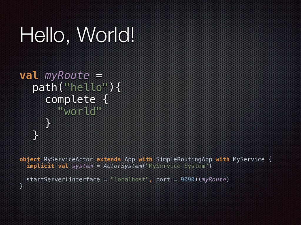 } object MyServiceActor extends App with SimpleRoutingApp with MyService { implicit val system = ActorSystem("MyService-System") startServer(interface = "localhost", port = 9090)(myRoute) }