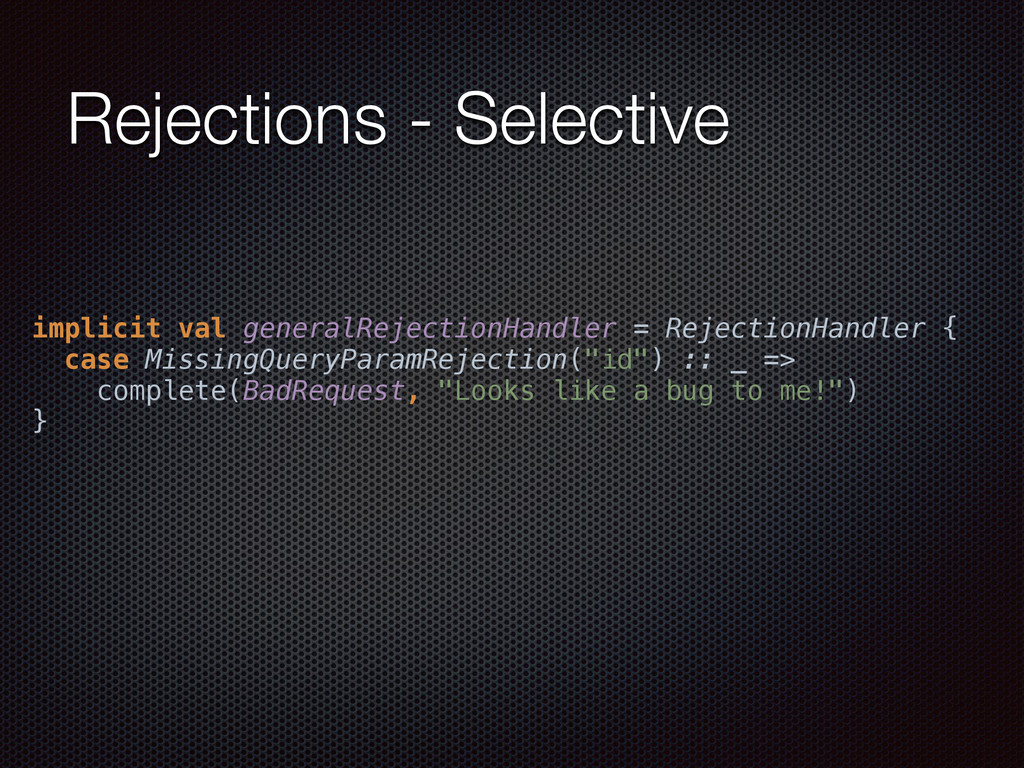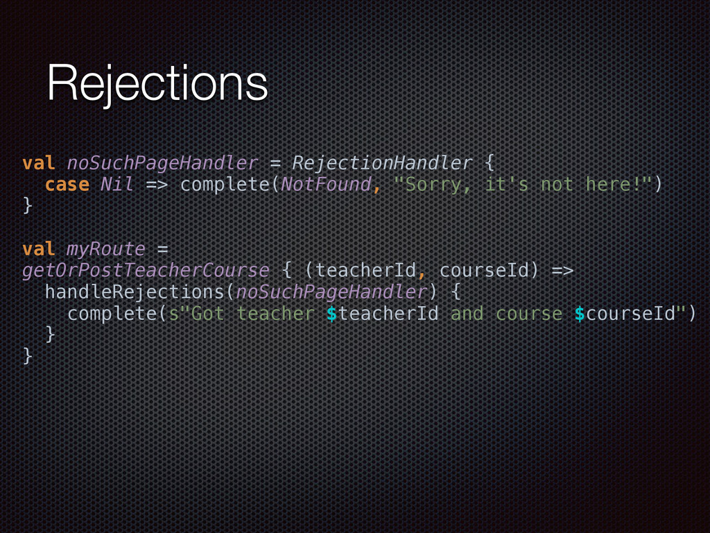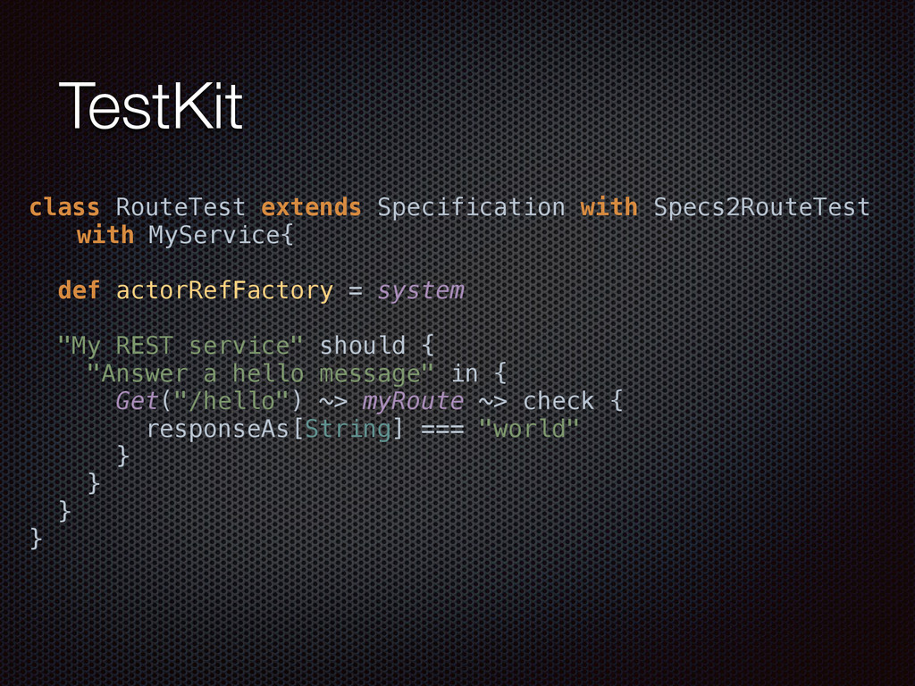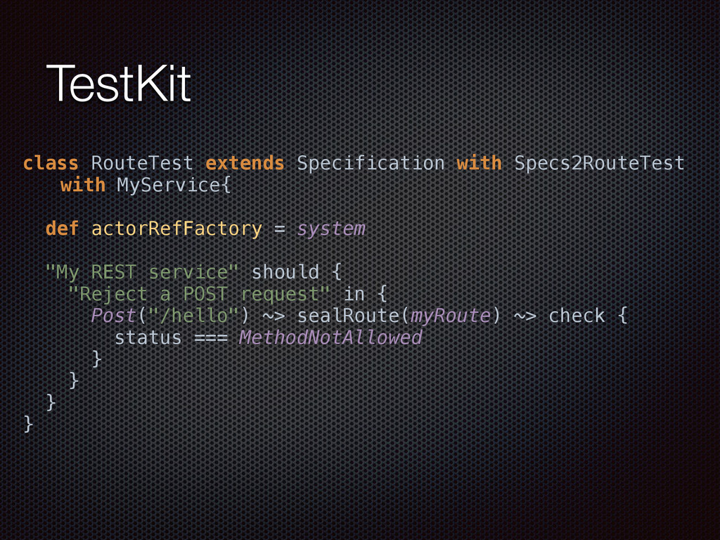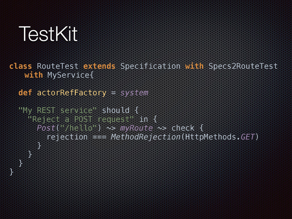 def actorRefFactory = system "My REST service" should { "Reject a POST request" in { Post("/hello") ~> myRoute ~> check { rejection === MethodRejection(HttpMethods.GET) } } } }