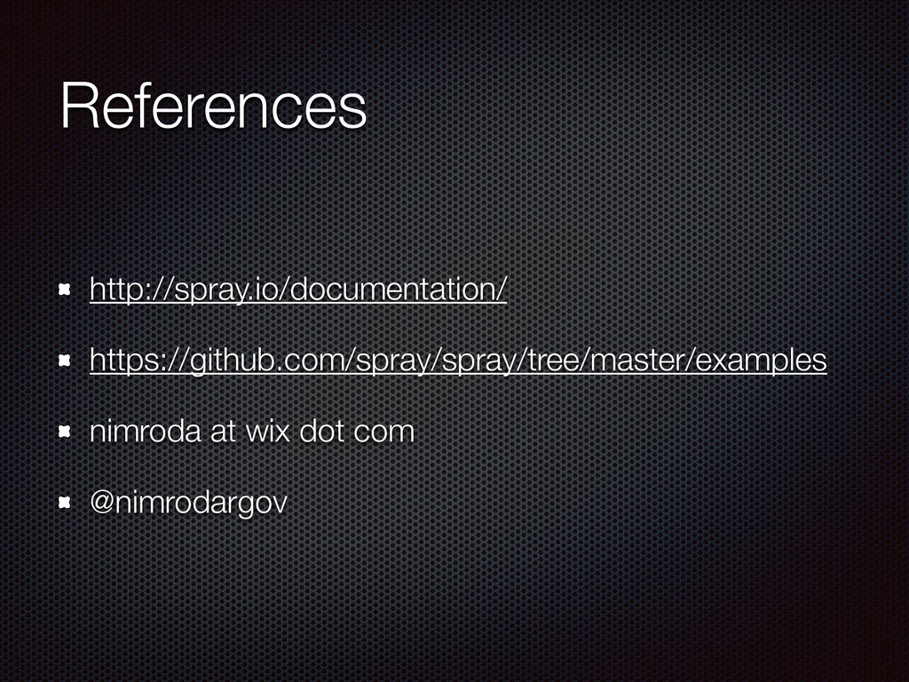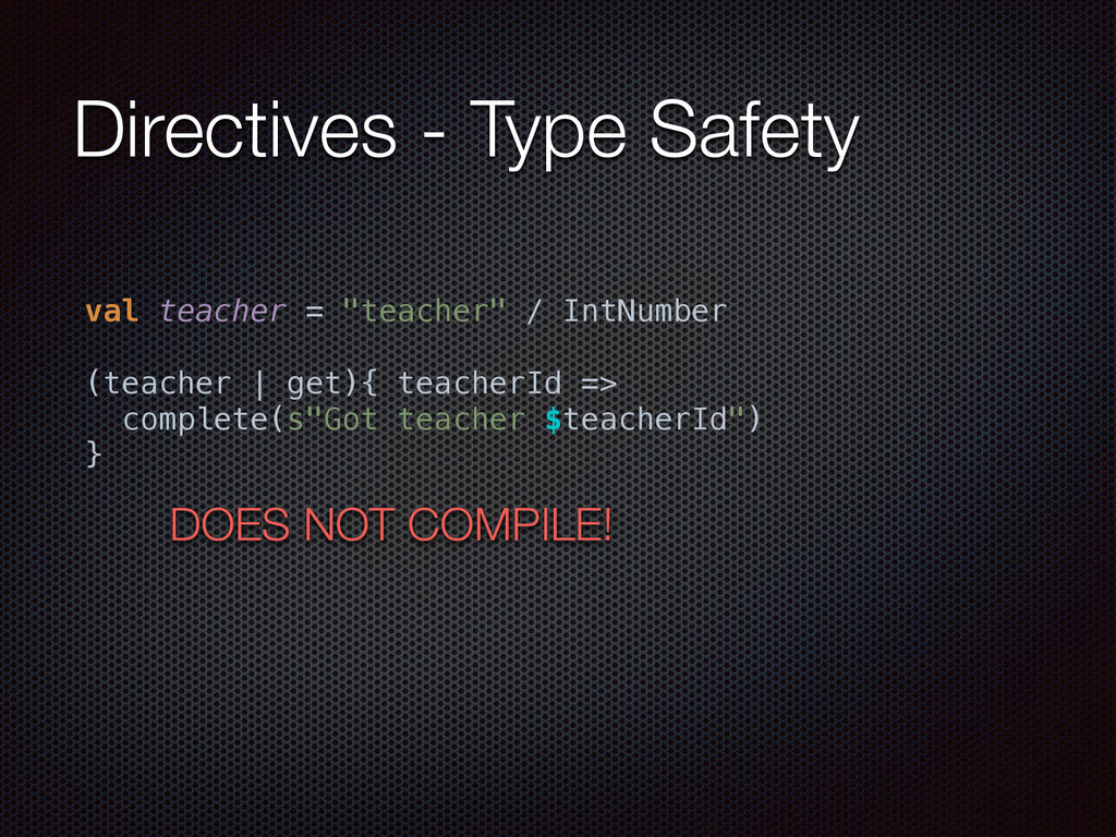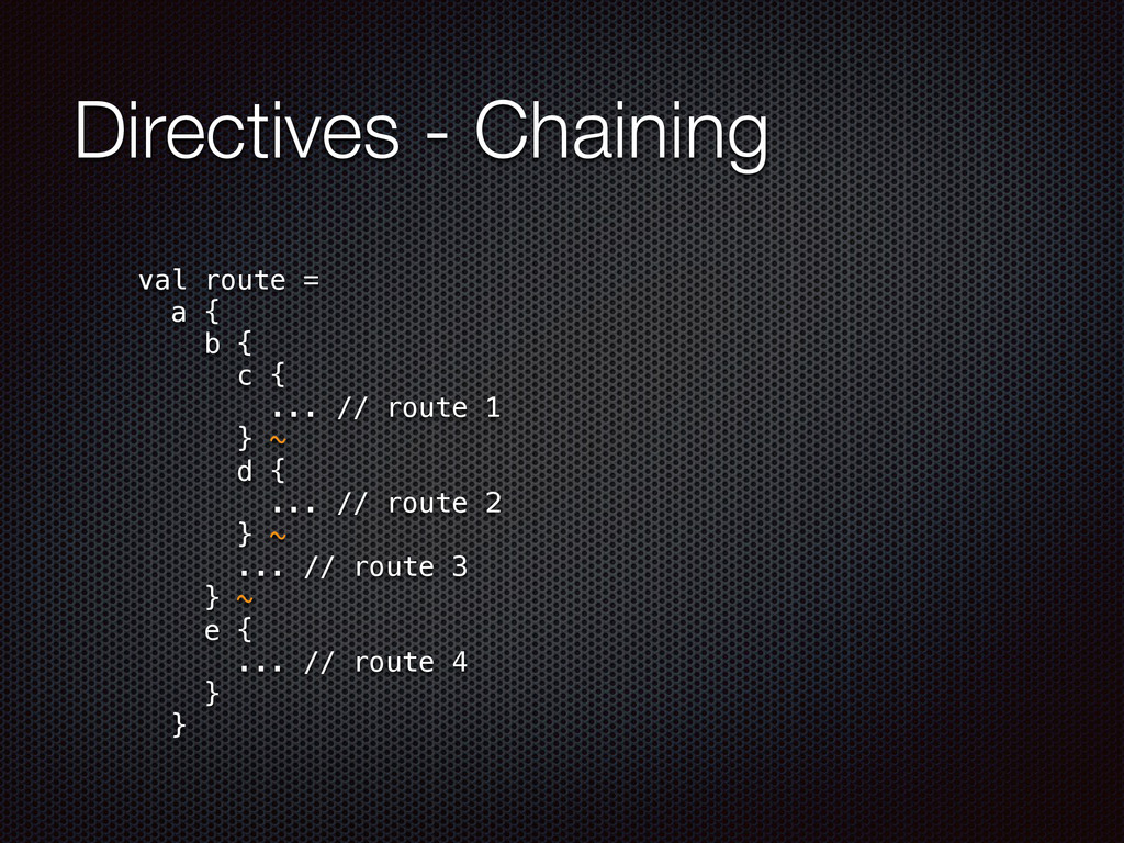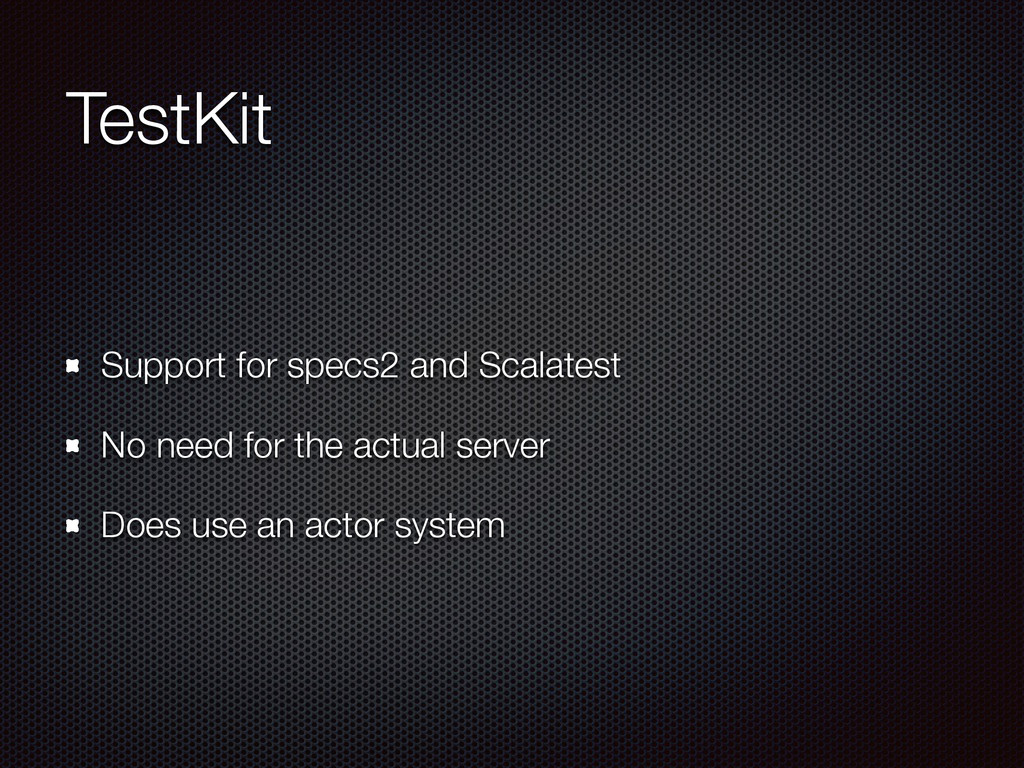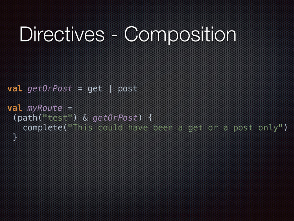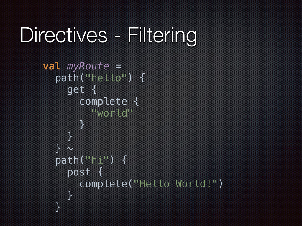 def actorRefFactory = system "My REST service" should { "Reject a POST request" in { Post("/hello") ~> myRoute ~> check { rejection === MethodRejection(HttpMethods.GET) } } } }