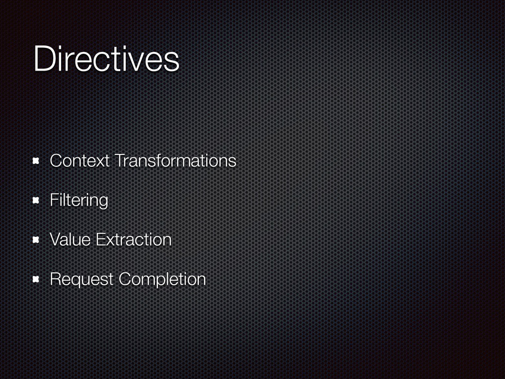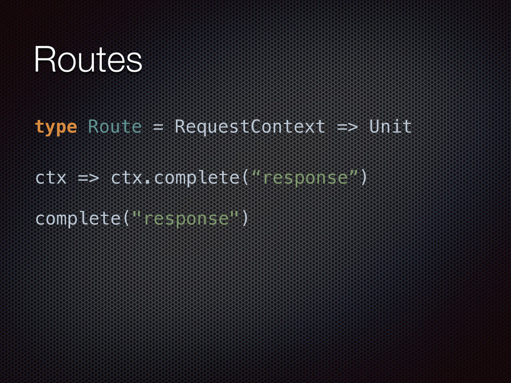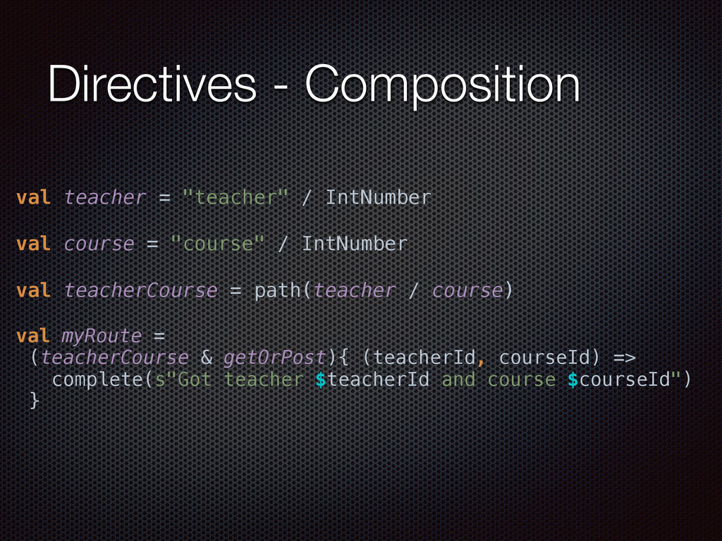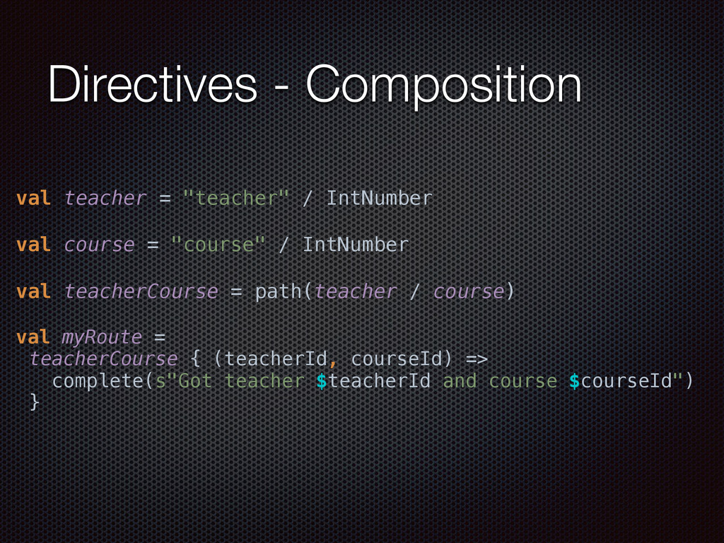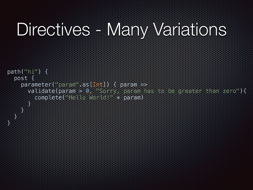 def actorRefFactory = system "My REST service" should { "Reject a POST request" in { Post("/hello") ~> myRoute ~> check { rejection === MethodRejection(HttpMethods.GET) } } } }