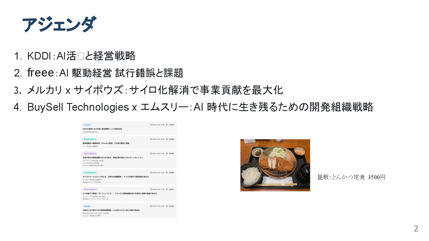 x サイボウズ:サイロ化解消で事業貢献を最大化 4. BuySell Technologies x エムスリー:AI 時代に生き残るための開発組織戦略 昼飯:とんかつ定食 3500円