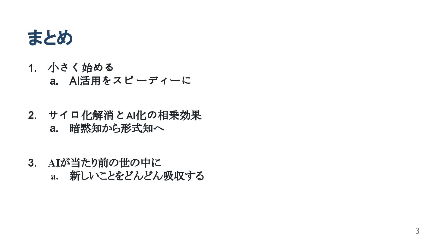 まとめ 3 1. ⼩さく始める a. AI活用をスピ ーディーに 2. サイロ化解消とAI化の相乗効果 a.