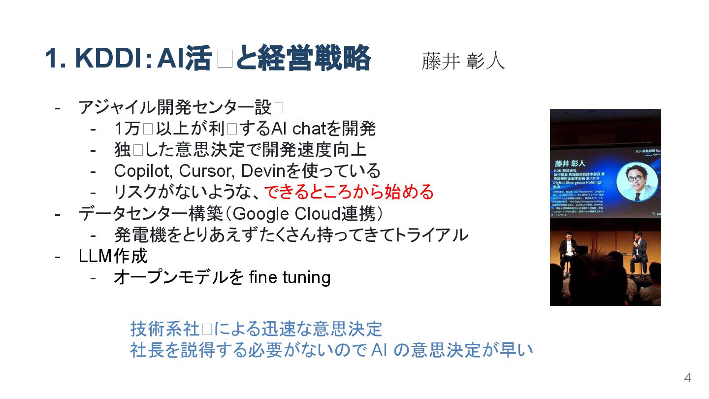 1. KDDI:AI活⽤と経営戦略 - アジャイル開発センター設⾃ - 1万⾃以上が利⾃するAI chatを開発 - 独⾃した意思決定で開発速度向上 -
