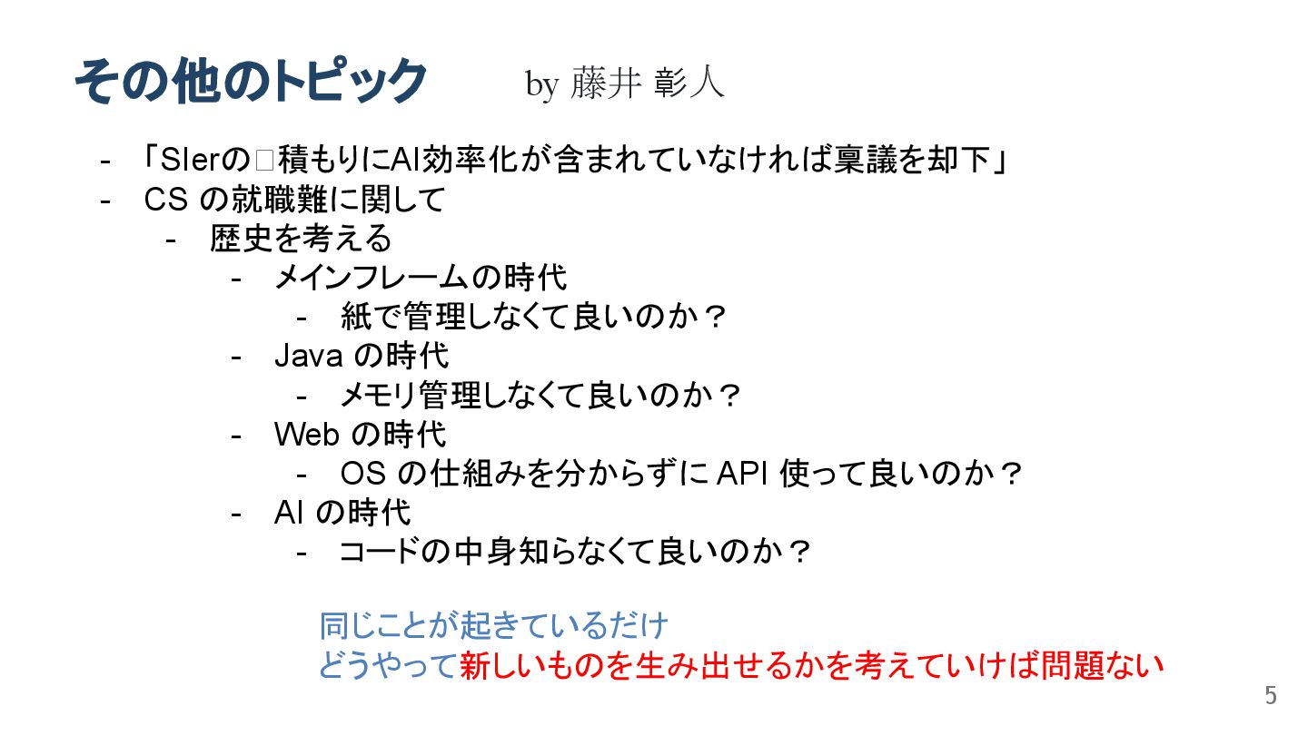 その他のトピック - 「SIerの⾃積もりにAI効率化が含まれていなければ稟議を却下」 - CS の就職難に関して - 歴史を考える - メインフレームの時代