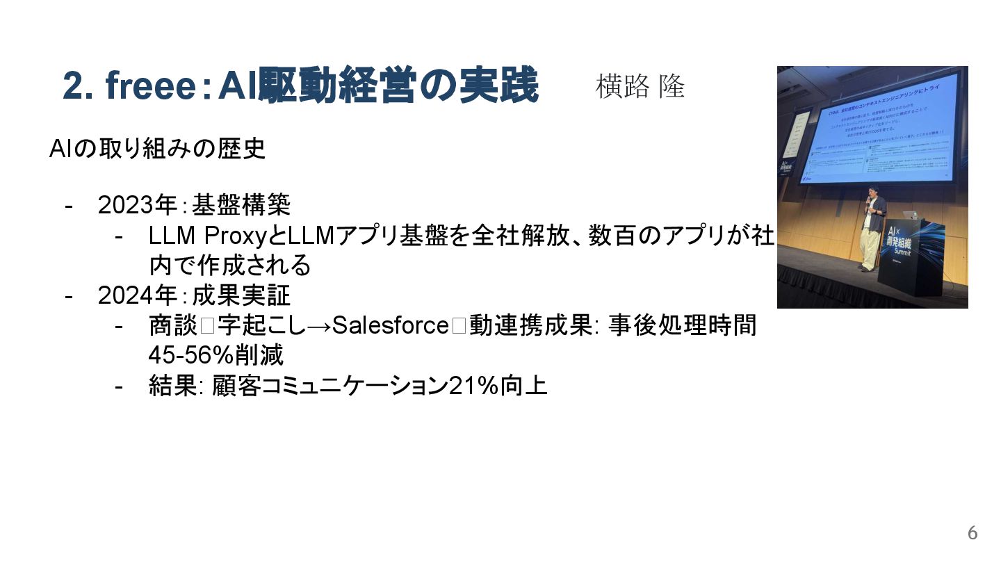 2. freee:AI駆動経営の実践 AIの取り組みの歴史 - 2023年:基盤構築 - LLM ProxyとLLMアプリ基盤を全社解放、数百のアプリが社 内で作成される -