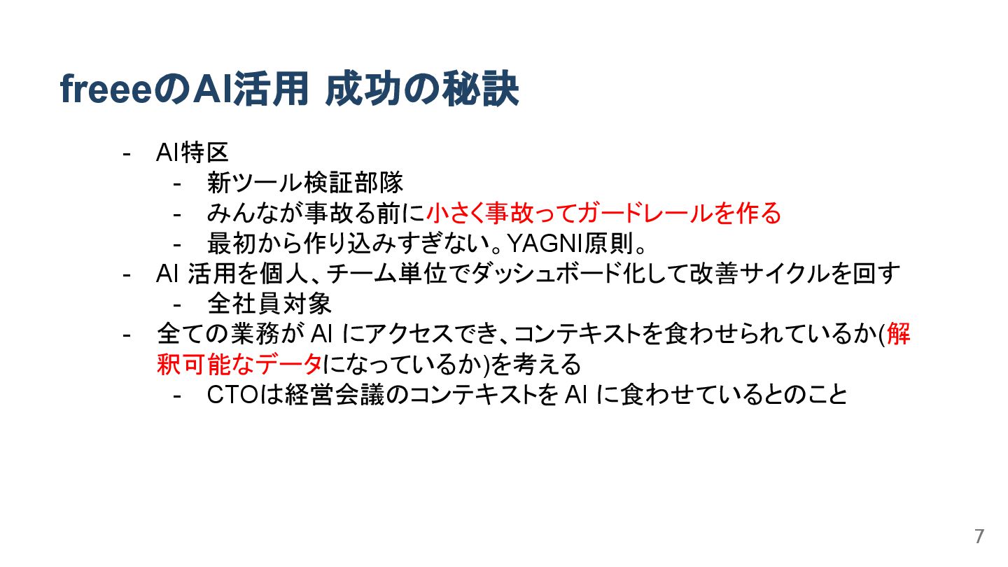 最初から作り込みすぎない。YAGNI原則。 - AI 活用を個人、チーム単位でダッシュボード化して改善サイクルを回す - 全社員対象 - 全ての業務が AI にアクセスでき、コンテキストを食わせられているか(解 釈可能なデータになっているか)を考える - CTOは経営会議のコンテキストを AI に食わせているとのこと