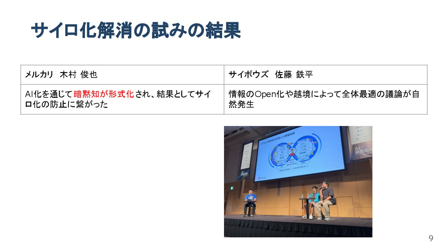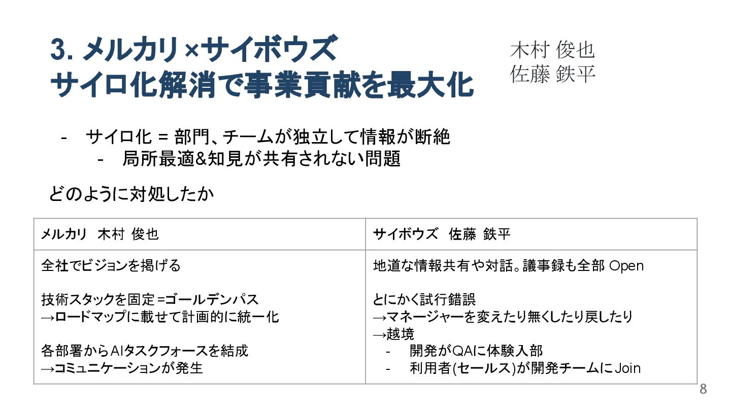 メルカリ 木村 俊也 サイボウズ 佐藤 鉄平 全社でビジョンを掲げる 技術スタックを固定=ゴールデンパス →ロードマップに載せて計画的に統一化 各部署からAIタスクフォースを結成 →コミュニケーションが発生 地道な情報共有や対話。議事録も全部 Open とにかく試行錯誤 →マネージャーを変えたり無くしたり戻したり →越境 - 開発がQAに体験入部 - 利用者(セールス)が開発チームにJoin 木村 俊也 佐藤 鉄平 どのように対処したか