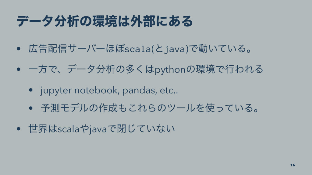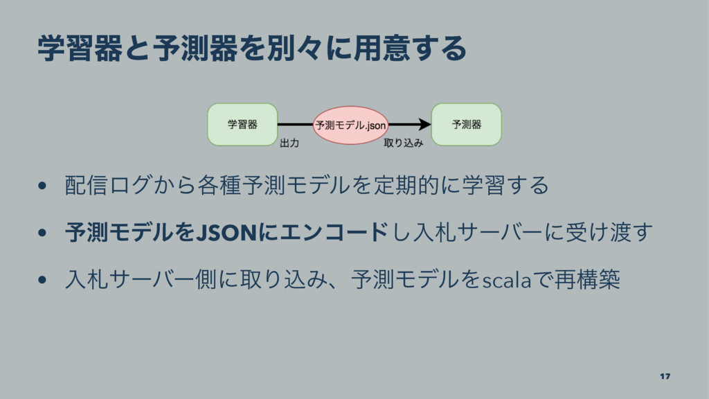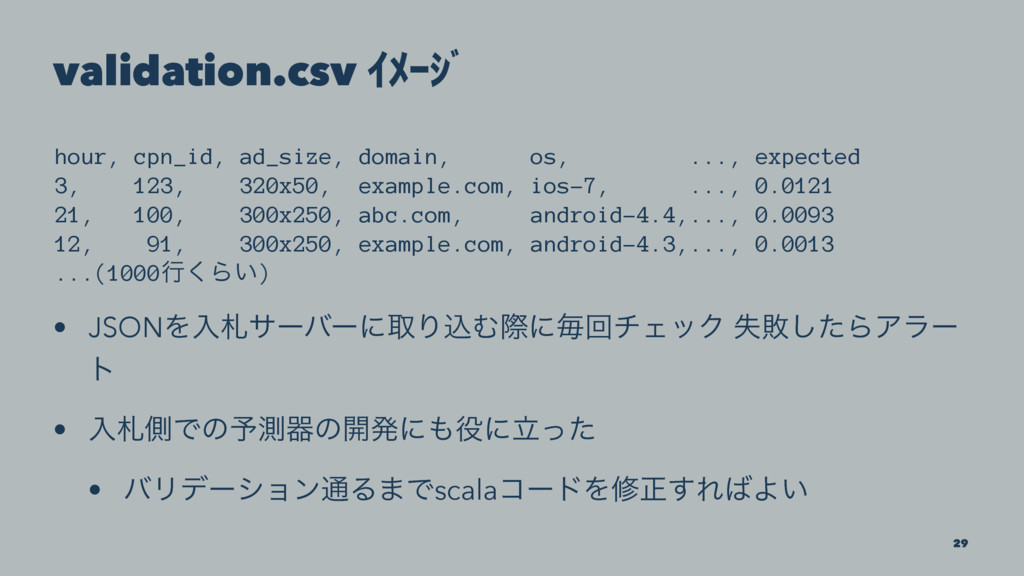 123, 320x50, example.com, ios-7, ..., 0.0121 21, 100, 300x250, abc.com, android-4.4,..., 0.0093 12, 91, 300x250, example.com, android-4.3,..., 0.0013 ...(1000ߦ͘Β͍) • JSONΛೖࡳαʔόʔʹऔΓࠐΉࡍʹຖճνΣοΫ ࣦഊͨ͠ΒΞϥʔ τ • ೖࡳଆͰͷ༧ଌثͷ։ൃʹʹཱͬͨ • όϦσʔγϣϯ௨Δ·ͰscalaίʔυΛमਖ਼͢ΕΑ͍ 29