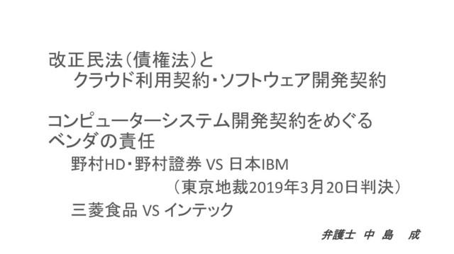 と障害の状況の下で、ベンダから完成や円滑な移行、 稼働開始後の運用保守を危惧することもやむを得な い見直し案提示しか受けられなかった場合、更なる費 用と期間を掛け、契約目的を変更してまで継続するべ きとはいえない。 野村側の社内事情によるとは認められない 【裁判所の判断】 争点③ 本件システムの完成が不能となった以上、各個別契約 は全て遡って履行不能となるといえるか ◦ 各個別契約が順次締結され、その個別具体的な 債務の履行の終了を順次積み重ねていくことにより、 段階的に達成されていくことが当事者間で予定されて いた。 ◦ 各契約に定められた工程が終了し、対価の支払 いが完了しても、なお最終的な契約目的が達成される まで債務が履行未了のものとして残存すると解するこ とは、契約当事者の合理的意思に反する。 本件システムの完成不能により、各個別契約が 遡って全て履行不能となるとはいえない 【裁判所の判断】 ~ 野村HD、野村證券 VS 日本IBM ~(3) 29