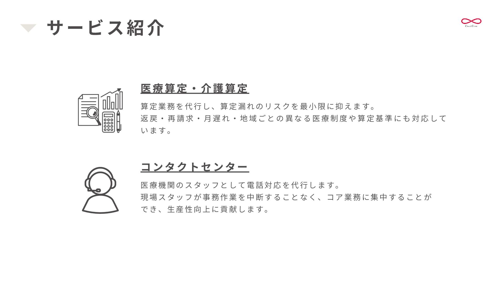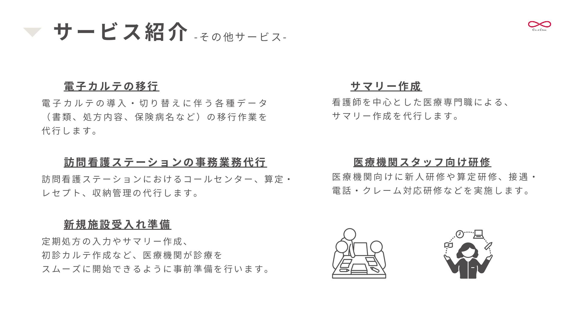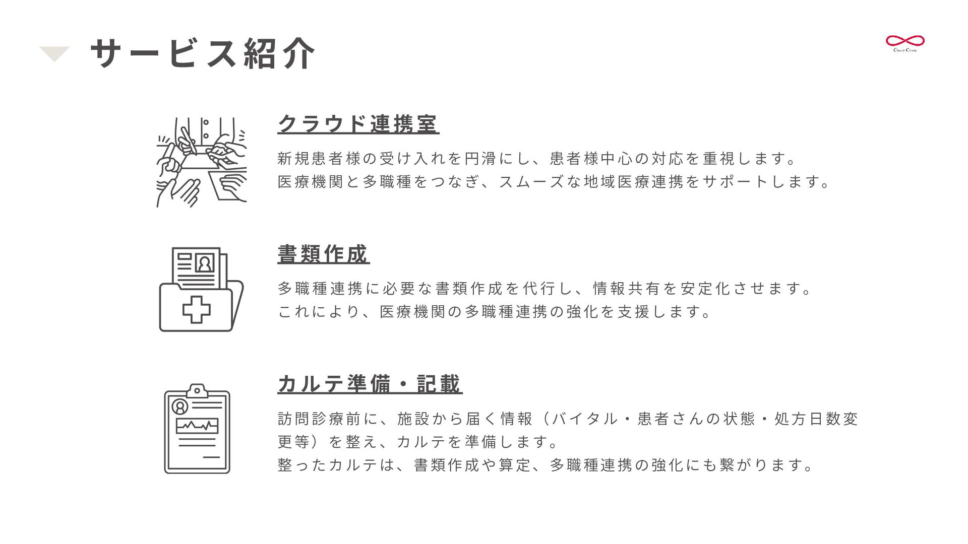 書 類 作 成 を 代 行 し 、 情 報 共 有 を 安 定 化 さ せ ま す 。 これにより、医療機関の多職種連携の強化を支援します。 書類作成 訪 問 診 療 前 に 、 施 設 か ら 届 く 情 報 ( バ イ タ ル ・ 患 者 さ ん の 状 態 ・ 処 方 日 数 変 更等)を整え、カルテを準備します。 整ったカルテは、書類作成や算定、多職種連携の強化にも繋がります。 カルテ準備・記載 クラウド連携室 新規患者様の受け入れを円滑にし、患者様中心の対応を重視します。 医療機関と多職種をつなぎ、スムーズな地域医療連携をサポートします。