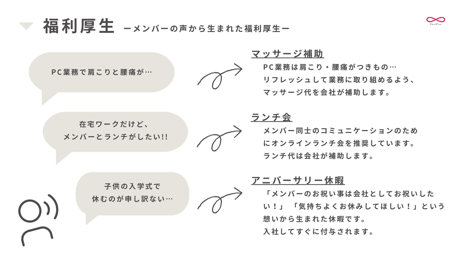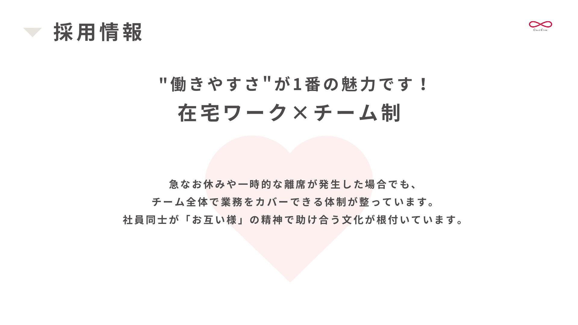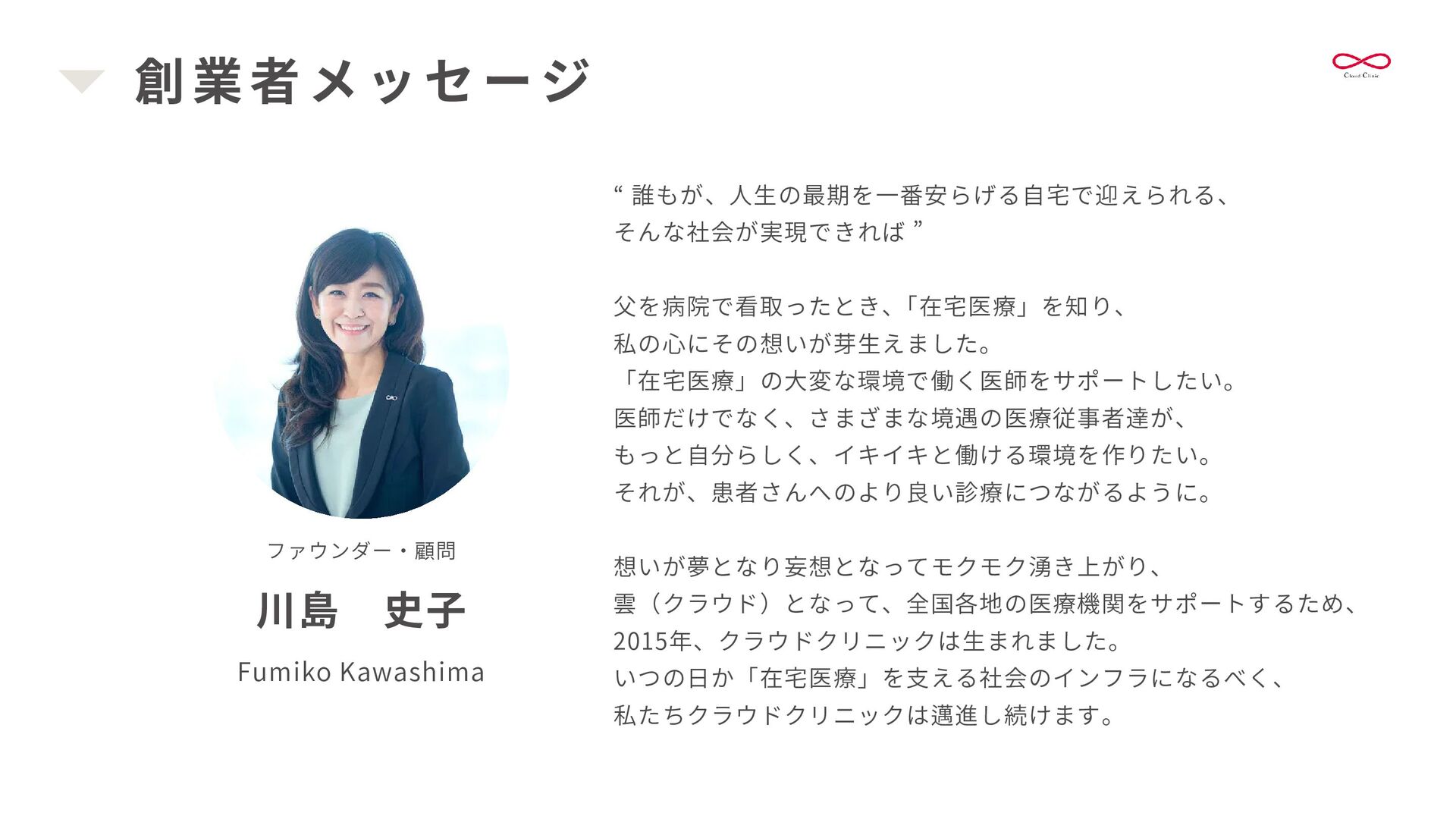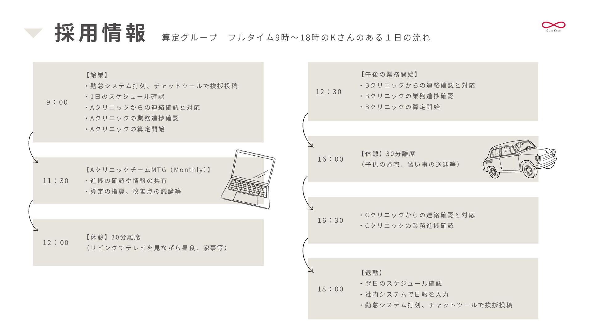 書 類 作 成 を 代 行 し 、 情 報 共 有 を 安 定 化 さ せ ま す 。 これにより、医療機関の多職種連携の強化を支援します。 書類作成 訪 問 診 療 前 に 、 施 設 か ら 届 く 情 報 ( バ イ タ ル ・ 患 者 さ ん の 状 態 ・ 処 方 日 数 変 更等)を整え、カルテを準備します。 整ったカルテは、書類作成や算定、多職種連携の強化にも繋がります。 カルテ準備・記載 クラウド連携室 新規患者様の受け入れを円滑にし、患者様中心の対応を重視します。 医療機関と多職種をつなぎ、スムーズな地域医療連携をサポートします。