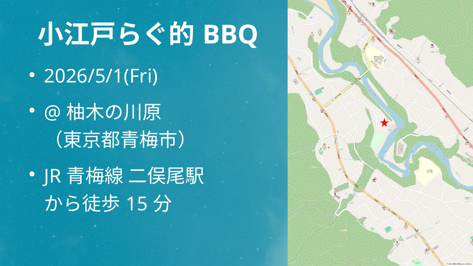 小江戸らぐ的 BBQ • 2026/5/1(Fri) • @ 柚木の川原 (東京都青梅市) • JR