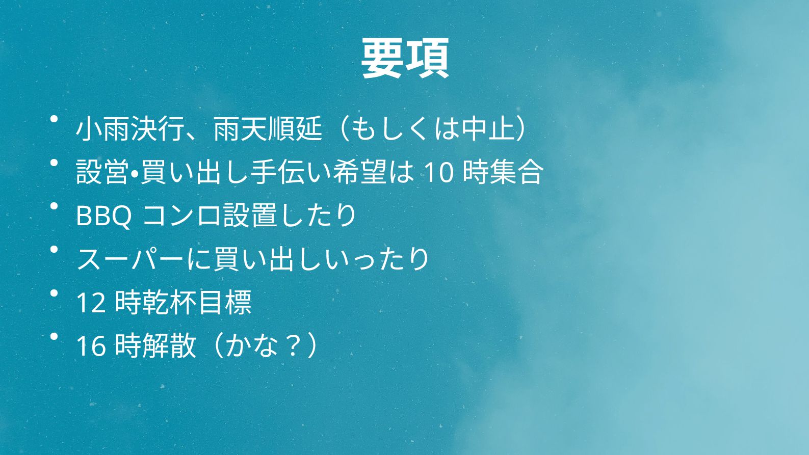 要項 • 小雨決行、雨天順延(もしくは中止) • 設営・買い出し手伝い希望は 10 時集合 • BBQ コンロ設置したり