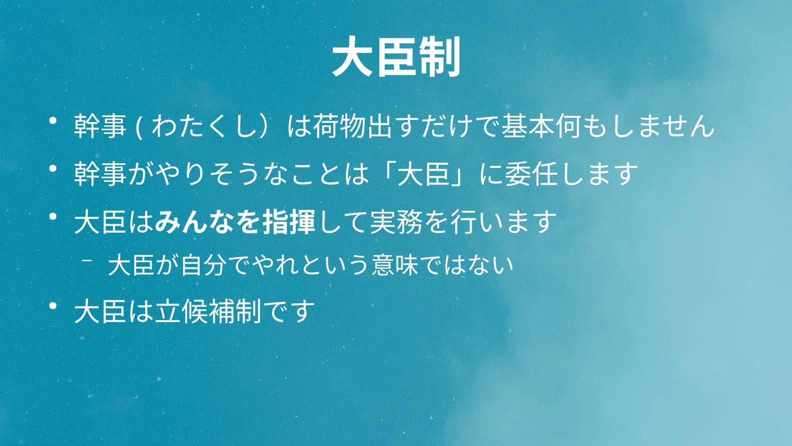 大臣制 • 幹事 ( わたくし)は荷物出すだけで基本何もしません • 幹事がやりそうなことは「大臣」に委任します • 大臣はみんなを指揮して実務を行います –