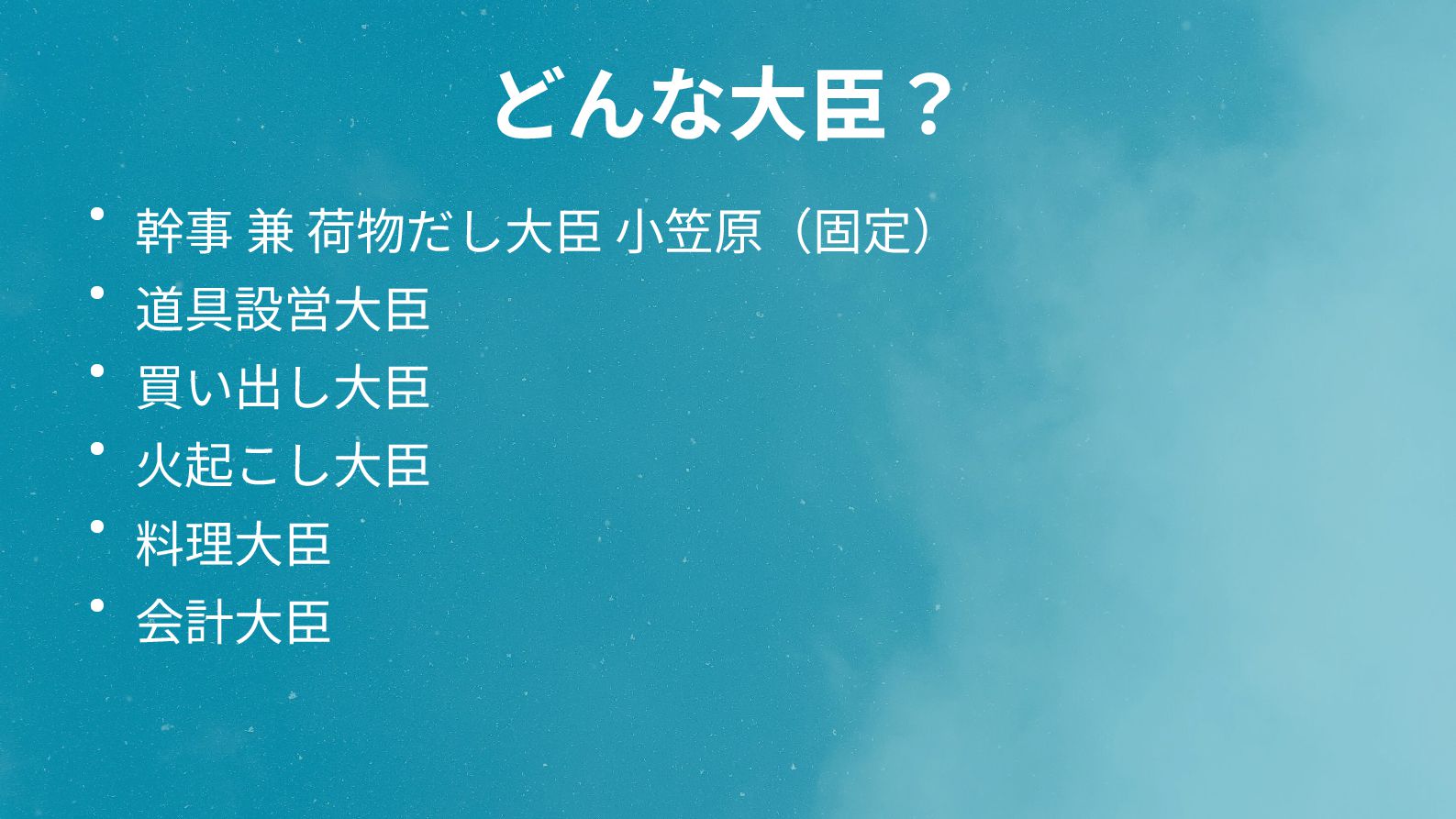 • 火起こし大臣 • 料理大臣 • 会計大臣