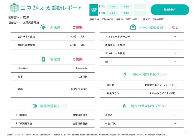FIT期間中 0 6,591 0 FIT期間中 10 10 16 8.5 0 0 3,776 3,776 0 0 9,363 8,340 3,405 3,405 (設備なしと比較した場合) (設備なしと比較した場合) 7,181 7,181 2,182 1,159 6 ご提案 商材 FIT中 FIT後 診断ID: 診断日時: 世帯ID: 光熱費 現 在 電気代 円 現在 ガス代 円 F I T 中 電気代 円 ガス代 円 FIT期間 F I T 後 電気代 円 終了後 ガス代 円 年 FIT期間終了後 年 買取単価 円 買取単価 円 節約額 電気料金プラン変更 円 節約額 電気料金プラン変更 円 太陽光(自家消費) 円 太陽光(自家消費) 円 オール電化 円 オール電化 円 円 円 蓄電池 円 蓄電池 円 節約額合計 円 節約額合計 円 売電収入 円 売電収入 円 0 2,000 4,000 6,000 8,000 10,000 12,000 14,000 16,000 太陽光(売電収入) 光熱費(電気+ガス) 蓄電池 太陽光(自家消費) 電気料金プラン変更 オール電化 1 カ月の 実質削減額 合計 1 カ月の 実質削減額 合計 (円) 1 ヶ月の シミュレーション 注意事項: シミュレーション結果につきましては、お客様の生活パターン、機器の使い方、省エネルギー機器の種類、燃料価格の変動や気候の変化、その他の要因等により変動するため、実際の結果を保証するものではなく、あくまで目安としてご利用ください。