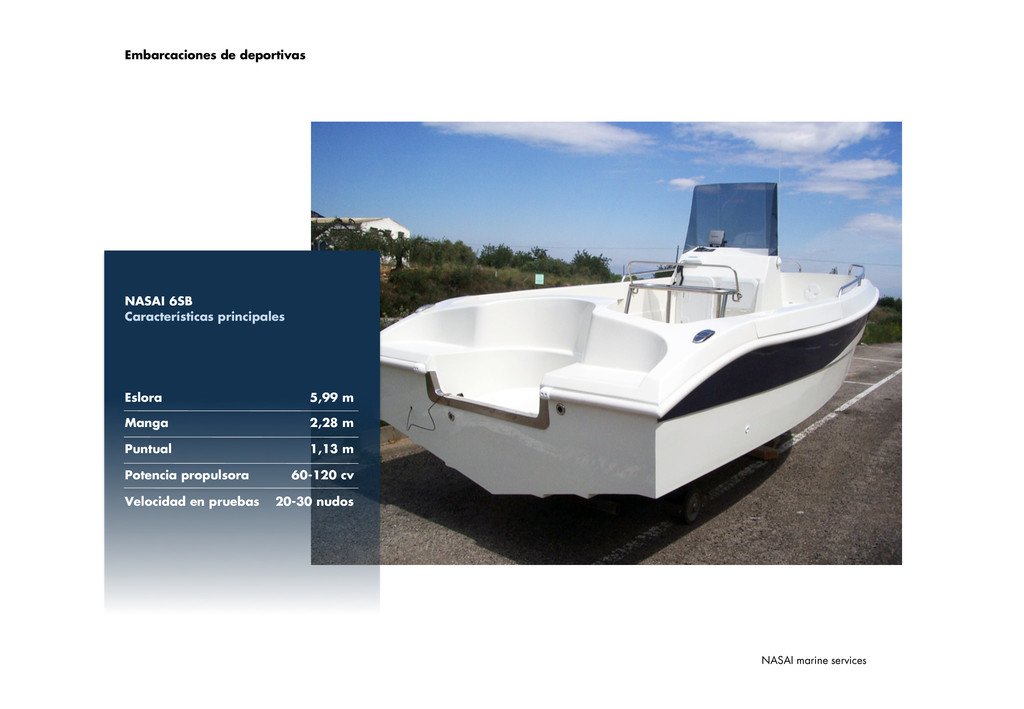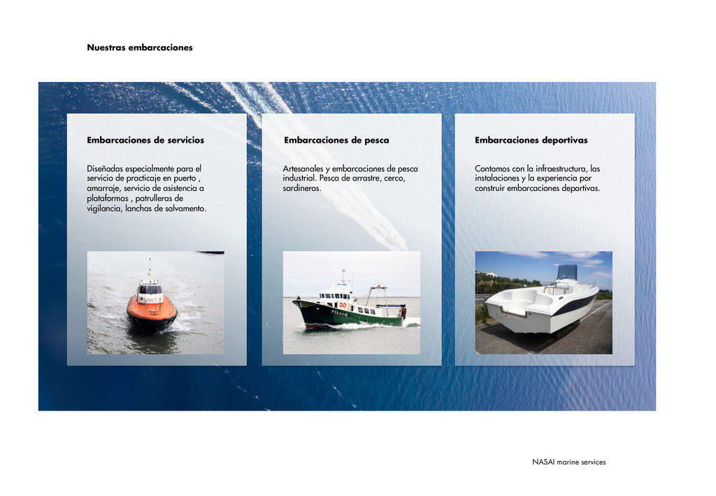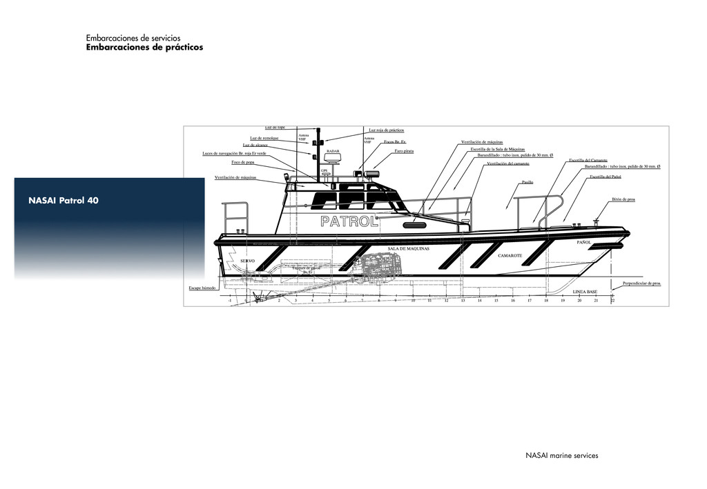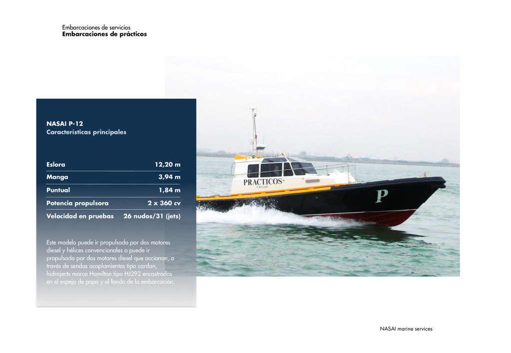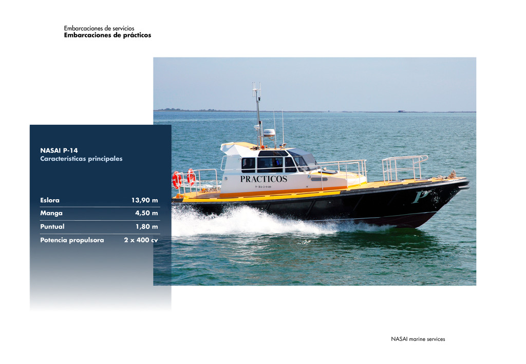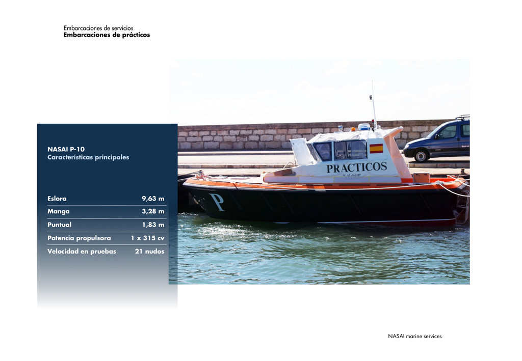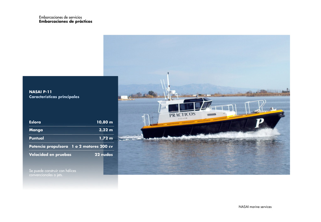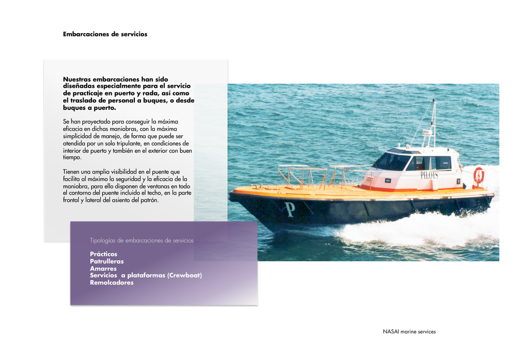practicaje en puerto y rada, asà como el traslado de personal a buques, o desde buques a puerto. Se han proyectado para conseguir la máxima eficacia en dichas maniobras, con la máxima simplicidad de manejo, de forma que puede ser atendida por un solo tripulante, en condiciones de interior de puerto y también en el exterior con buen tiempo. Tienen una amplia visibilidad en el puente que facilita al máximo la seguridad y la eficacia de la maniobra, para ello disponen de ventanas en todo el contorno del puente incluido el techo, en la parte frontal y lateral del asiento del patrón. Embarcaciones de servicios TipologÃas de embarcaciones de servicios Prácticos Patrulleras Amarres Servicios a plataformas (Crewboat) Remolcadores NASAI marine services