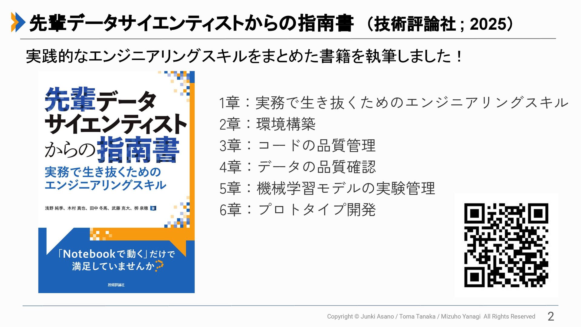 All Rights Reserved 1章:実務で生き抜くためのエンジニアリングスキル 2章:環境構築 3章:コードの品質管理 4章:データの品質確認 5章:機械学習モデルの実験管理 6章:プロトタイプ開発 2 先輩データサイエンティストからの指南書 (技術評論社 ; 2025) 実践的なエンジニアリングスキルをまとめた書籍を執筆しました!
