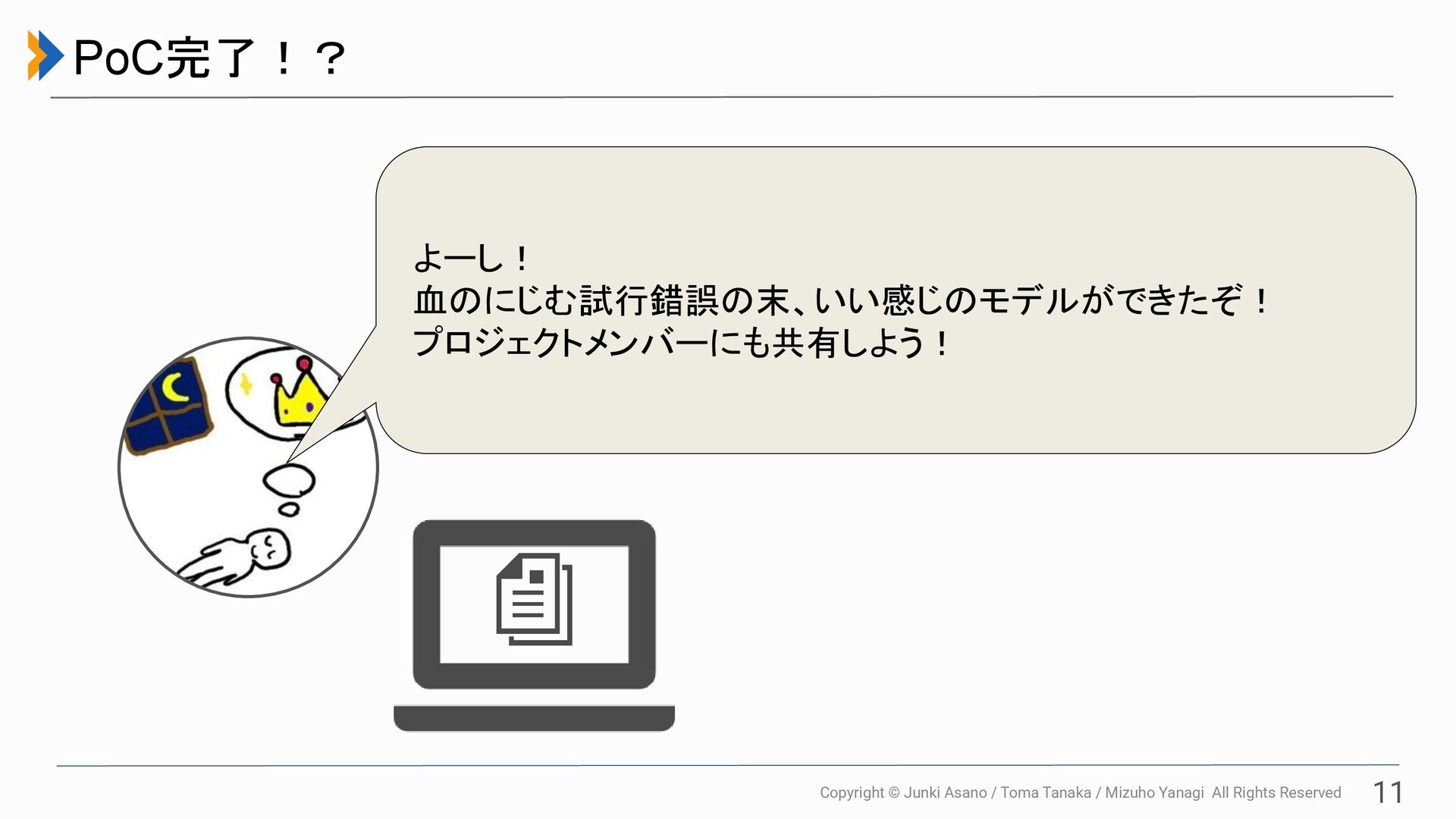 All Rights Reserved 11 PoC完了!? よーし! 血のにじむ試行錯誤の末、いい感じのモデルができたぞ! プロジェクトメンバーにも共有しよう!
