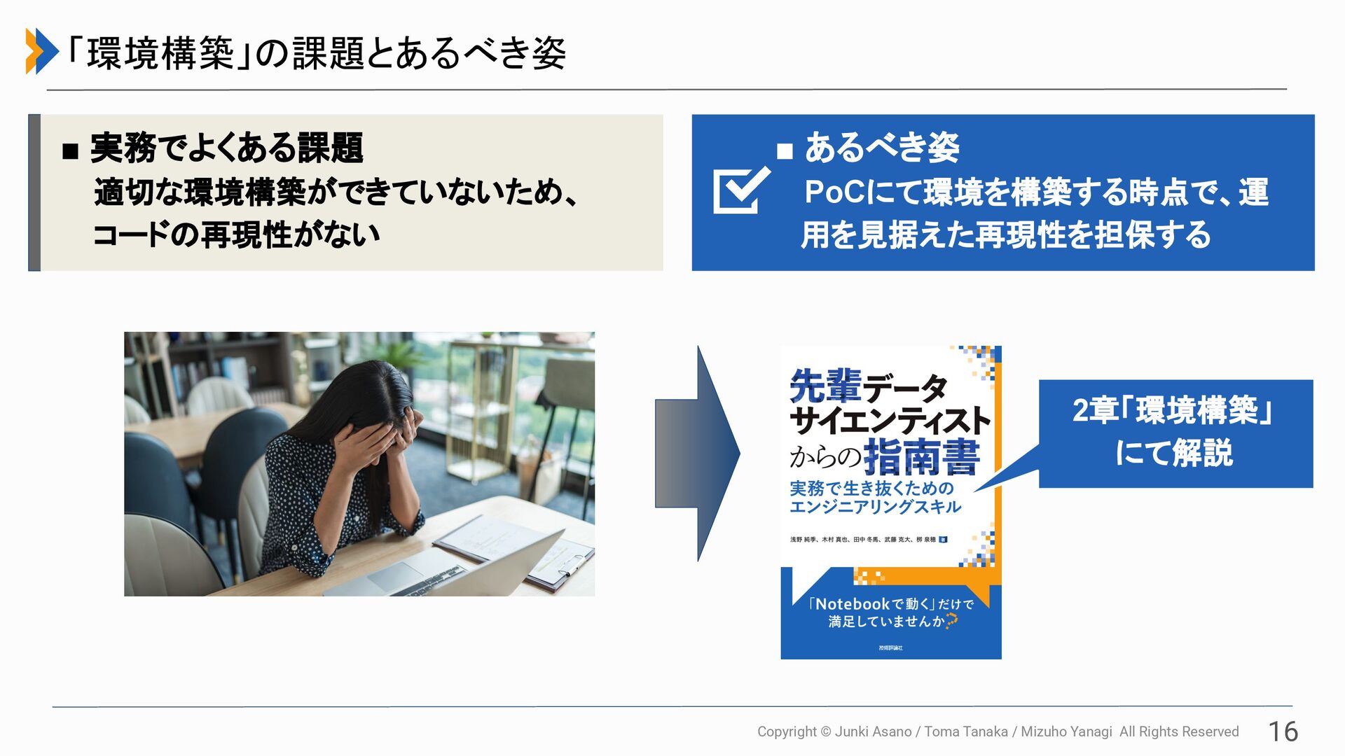 All Rights Reserved 16 「環境構築」の課題とあるべき姿 ▪ あるべき姿 PoCにて環境を構築する時点で、運 用を見据えた再現性を担保する 2章「環境構築」 にて解説 ▪ 実務でよくある課題 適切な環境構築ができていないため、 コードの再現性がない