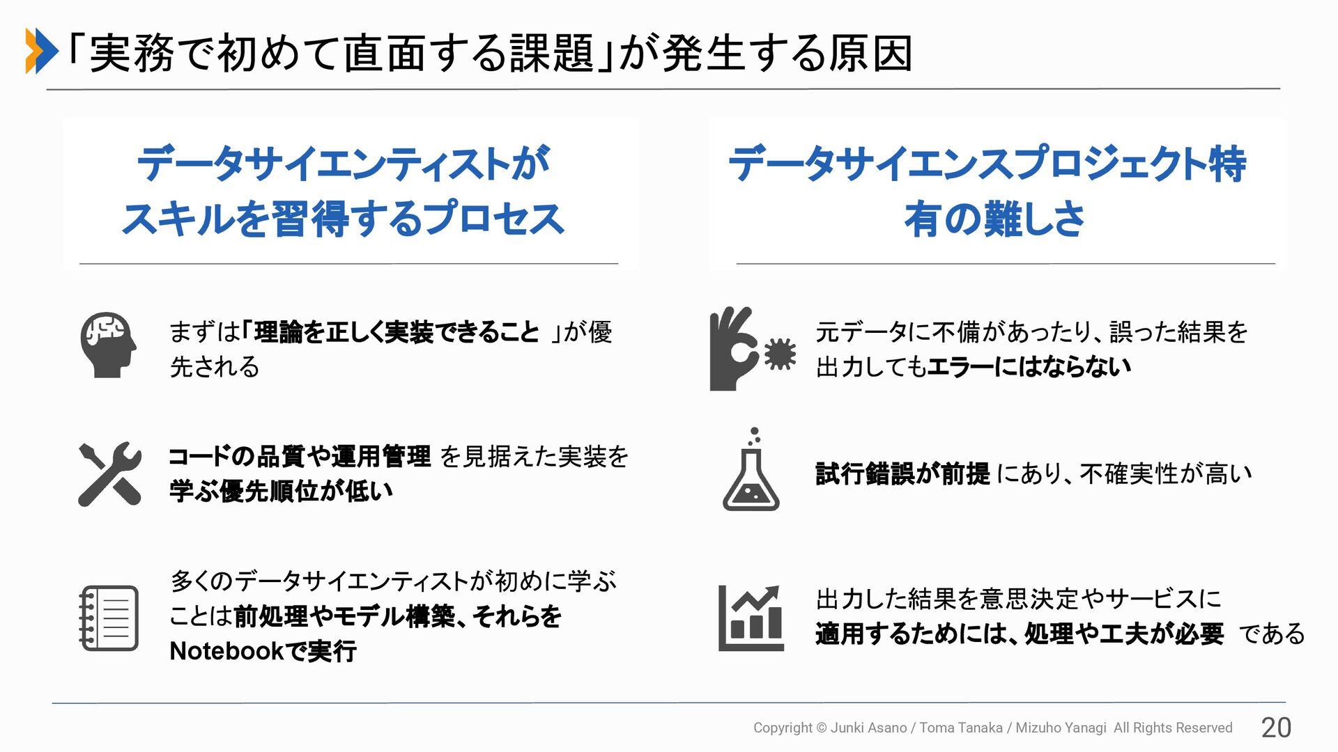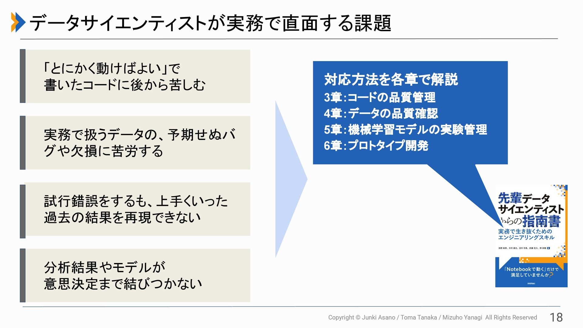 All Rights Reserved 18 データサイエンティストが実務で直面する課題 「とにかく動けばよい」で 書いたコードに後から苦しむ 実務で扱うデータの、予期せぬバ グや欠損に苦労する 試行錯誤をするも、上手くいった 過去の結果を再現できない 分析結果やモデルが 意思決定まで結びつかない 対応方法を各章で解説 3章:コードの品質管理 4章:データの品質確認 5章:機械学習モデルの実験管理 6章:プロトタイプ開発
