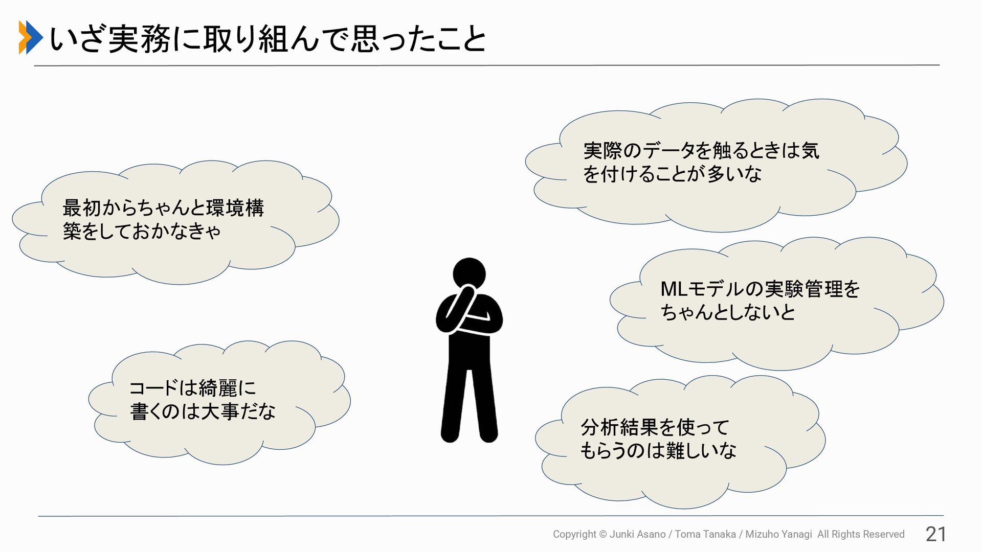 All Rights Reserved 20 「実務で初めて直面する課題」が発生する原因 データサイエンティストが スキルを習得するプロセス データサイエンスプロジェクト特 有の難しさ コードの品質や運用管理 を見据えた実装を 学ぶ優先順位が低い まずは「理論を正しく実装できること 」が優 先される 多くのデータサイエンティストが初めに学ぶ ことは前処理やモデル構築、それらを Notebookで実行 試行錯誤が前提 にあり、不確実性が高い 元データに不備があったり、誤った結果を 出力してもエラーにはならない 出力した結果を意思決定やサービスに 適用するためには、処理や工夫が必要 である