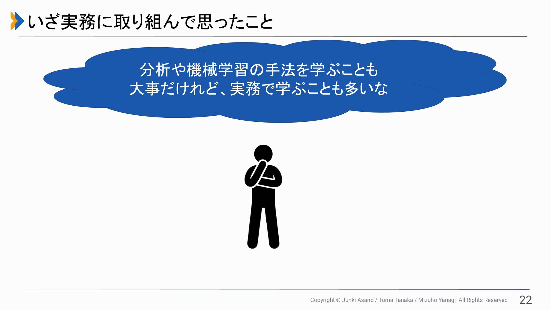 All Rights Reserved 21 いざ実務に取り組んで思ったこと 最初からちゃんと環境構 築をしておかなきゃ コードは綺麗に 書くのは大事だな 実際のデータを触るときは気 を付けることが多いな MLモデルの実験管理を ちゃんとしないと 分析結果を使って もらうのは難しいな