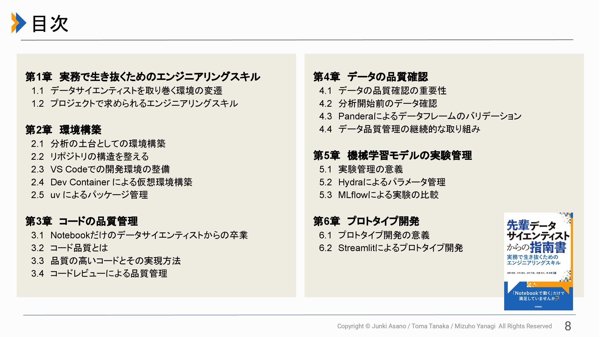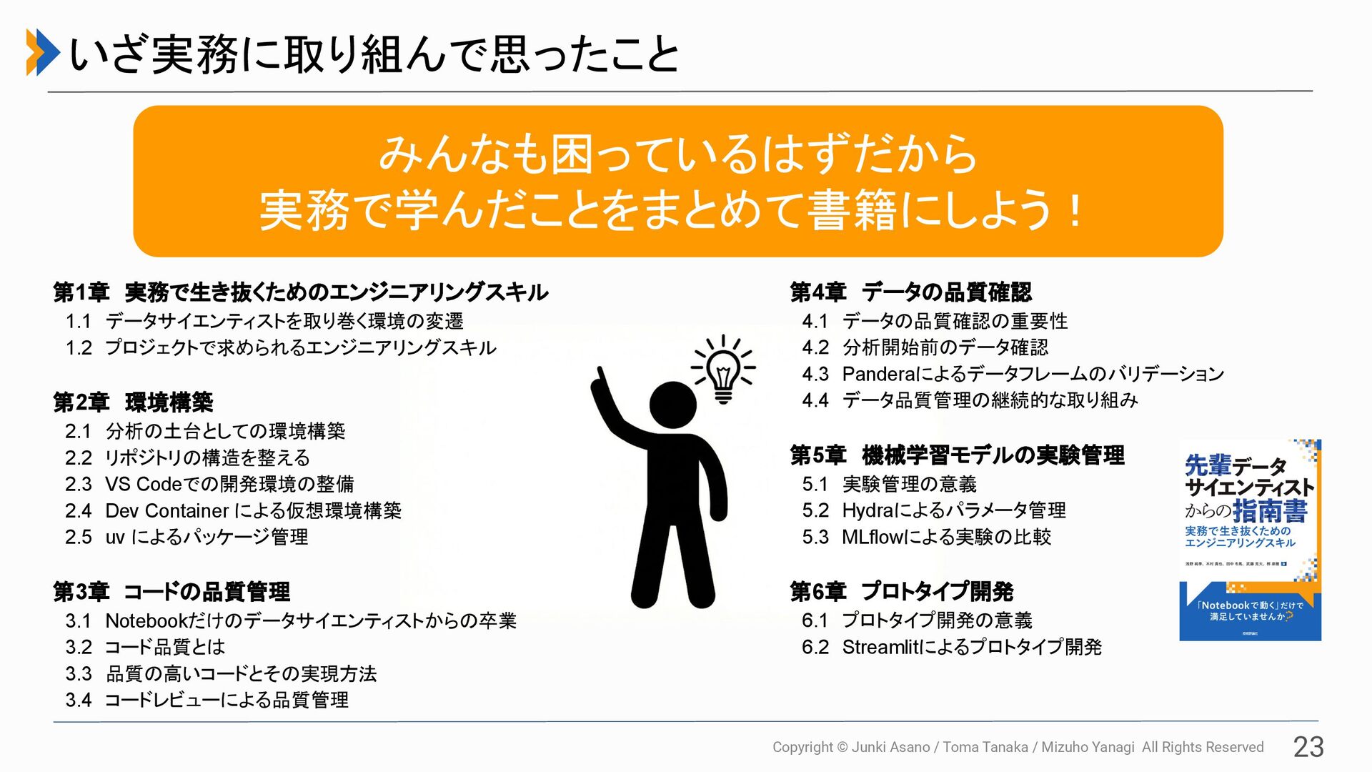 All Rights Reserved 23 いざ実務に取り組んで思ったこと みんなも困っているはずだから 実務で学んだことをまとめて書籍にしよう! 第1章 実務で生き抜くためのエンジニアリングスキル  1.1 データサイエンティストを取り巻く環境の変遷  1.2 プロジェクトで求められるエンジニアリングスキル 第2章 環境構築  2.1 分析の土台としての環境構築  2.2 リポジトリの構造を整える  2.3 VS Codeでの開発環境の整備  2.4 Dev Container による仮想環境構築  2.5 uv によるパッケージ管理 第3章 コードの品質管理  3.1 Notebookだけのデータサイエンティストからの卒業  3.2 コード品質とは  3.3 品質の高いコードとその実現方法  3.4 コードレビューによる品質管理 第4章 データの品質確認  4.1 データの品質確認の重要性  4.2 分析開始前のデータ確認  4.3 Panderaによるデータフレームのバリデーション  4.4 データ品質管理の継続的な取り組み 第5章 機械学習モデルの実験管理  5.1 実験管理の意義  5.2 Hydraによるパラメータ管理  5.3 MLflowによる実験の比較 第6章 プロトタイプ開発  6.1 プロトタイプ開発の意義  6.2 Streamlitによるプロトタイプ開発