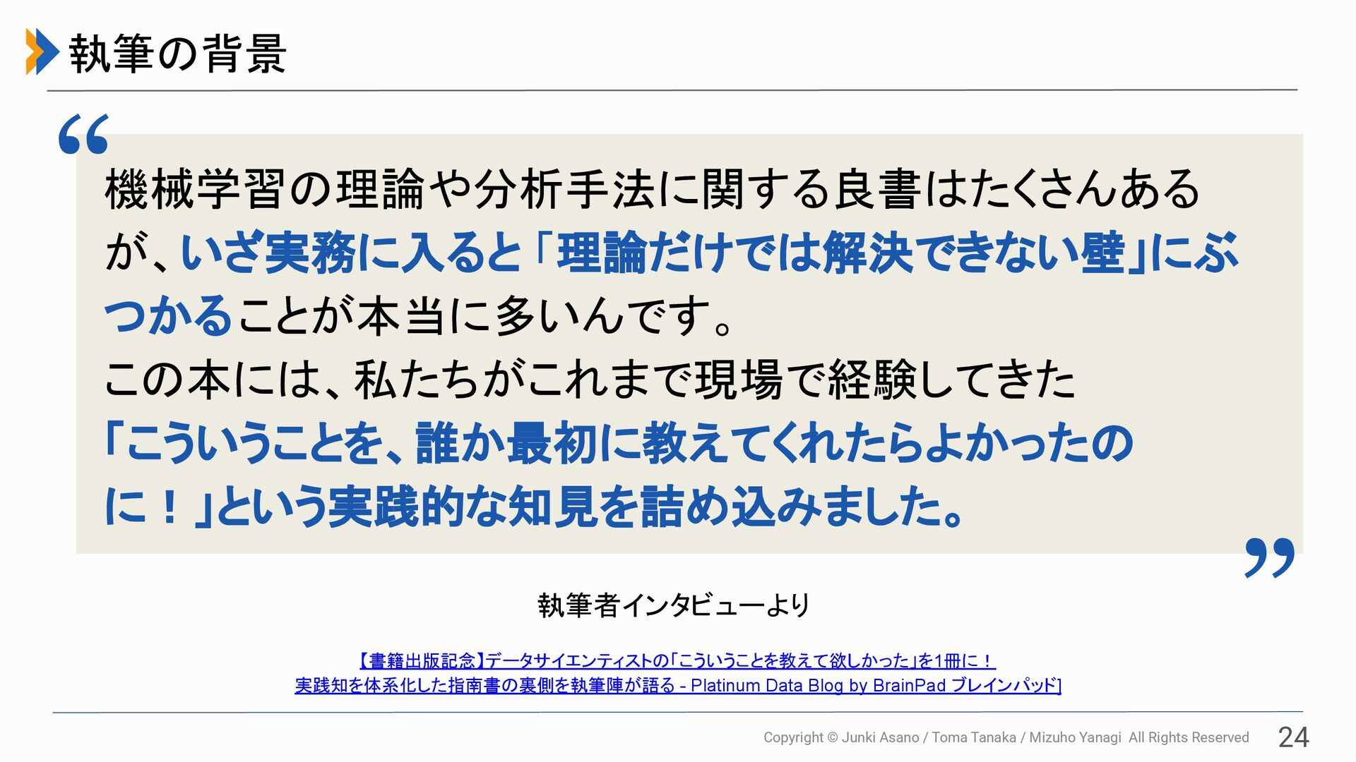 All Rights Reserved 24 執筆の背景 機械学習の理論や分析手法に関する良書はたくさんある が、いざ実務に入ると 「理論だけでは解決できない壁」にぶ つかることが本当に多いんです。 この本には、私たちがこれまで現場で経験してきた 「こういうことを、誰か最初に教えてくれたらよかったの に!」という実践的な知見を詰め込みました。 “ “ 執筆者インタビューより 【書籍出版記念】データサイエンティストの「こういうことを教えて欲しかった」を1冊に! 実践知を体系化した指南書の裏側を執筆陣が語る - Platinum Data Blog by BrainPad ブレインパッド]