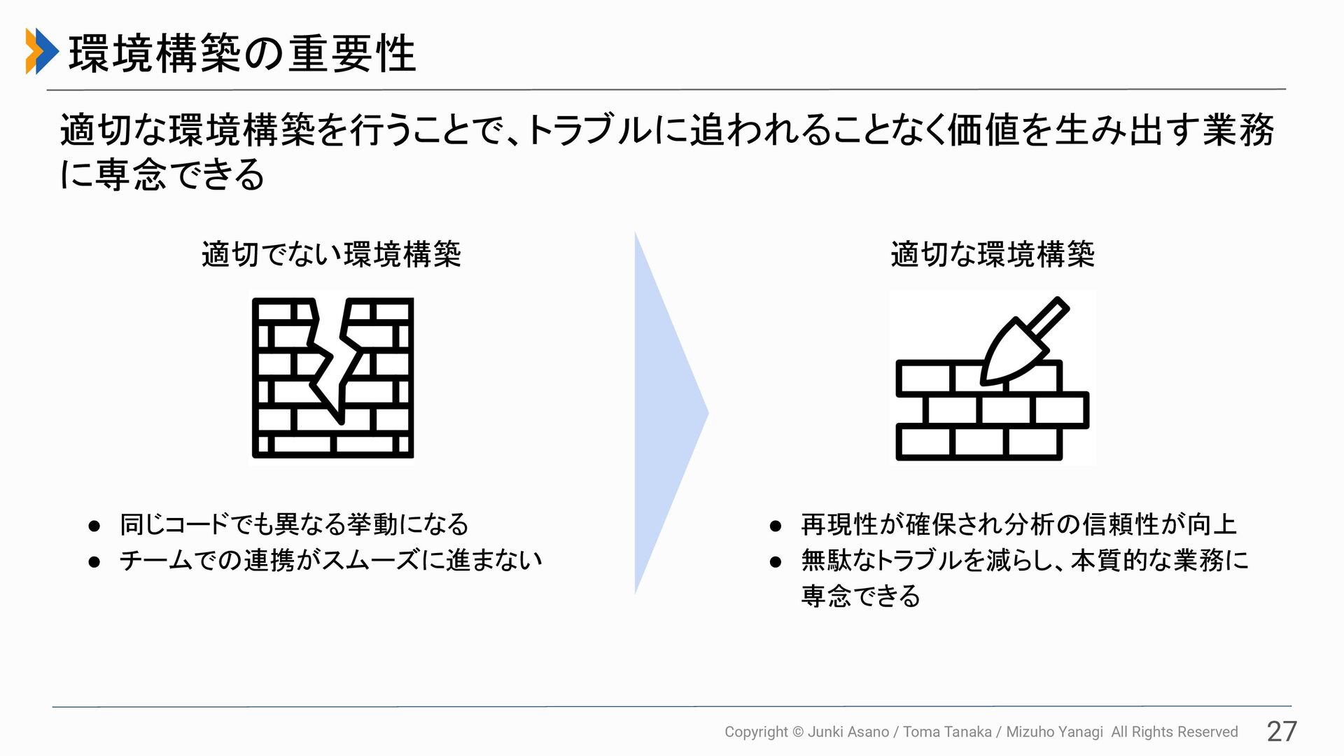 All Rights Reserved 26 多くの書籍では「環境構築」は 10ページ程度 本書では、プロジェクトを 成功に導くための基盤と考え 38ページにわたり解説