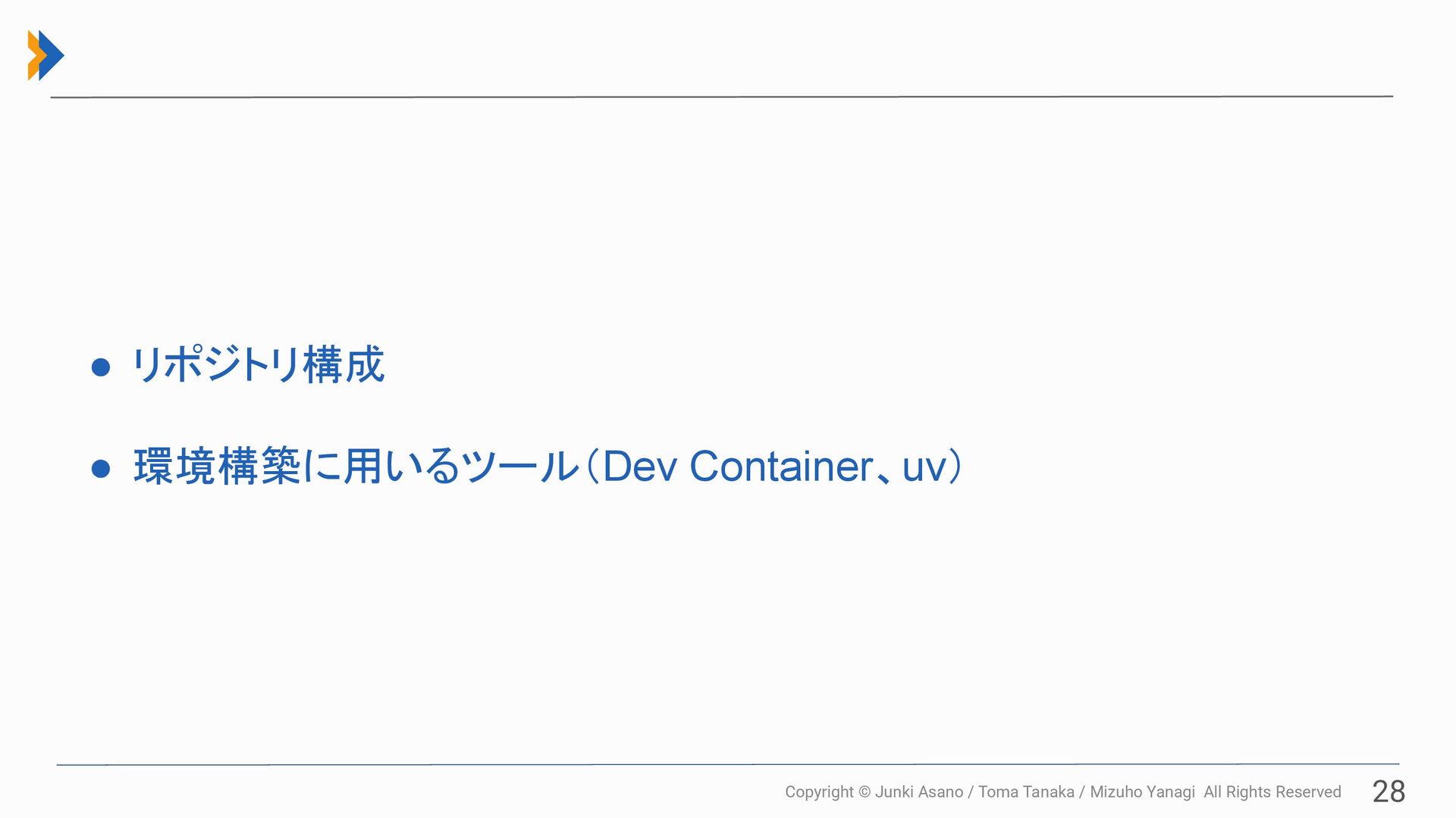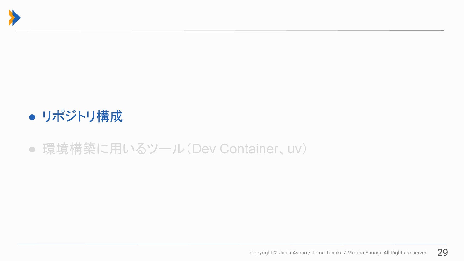 All Rights Reserved 28 • リポジトリ構成 • 環境構築に用いるツール(Dev Container、uv)