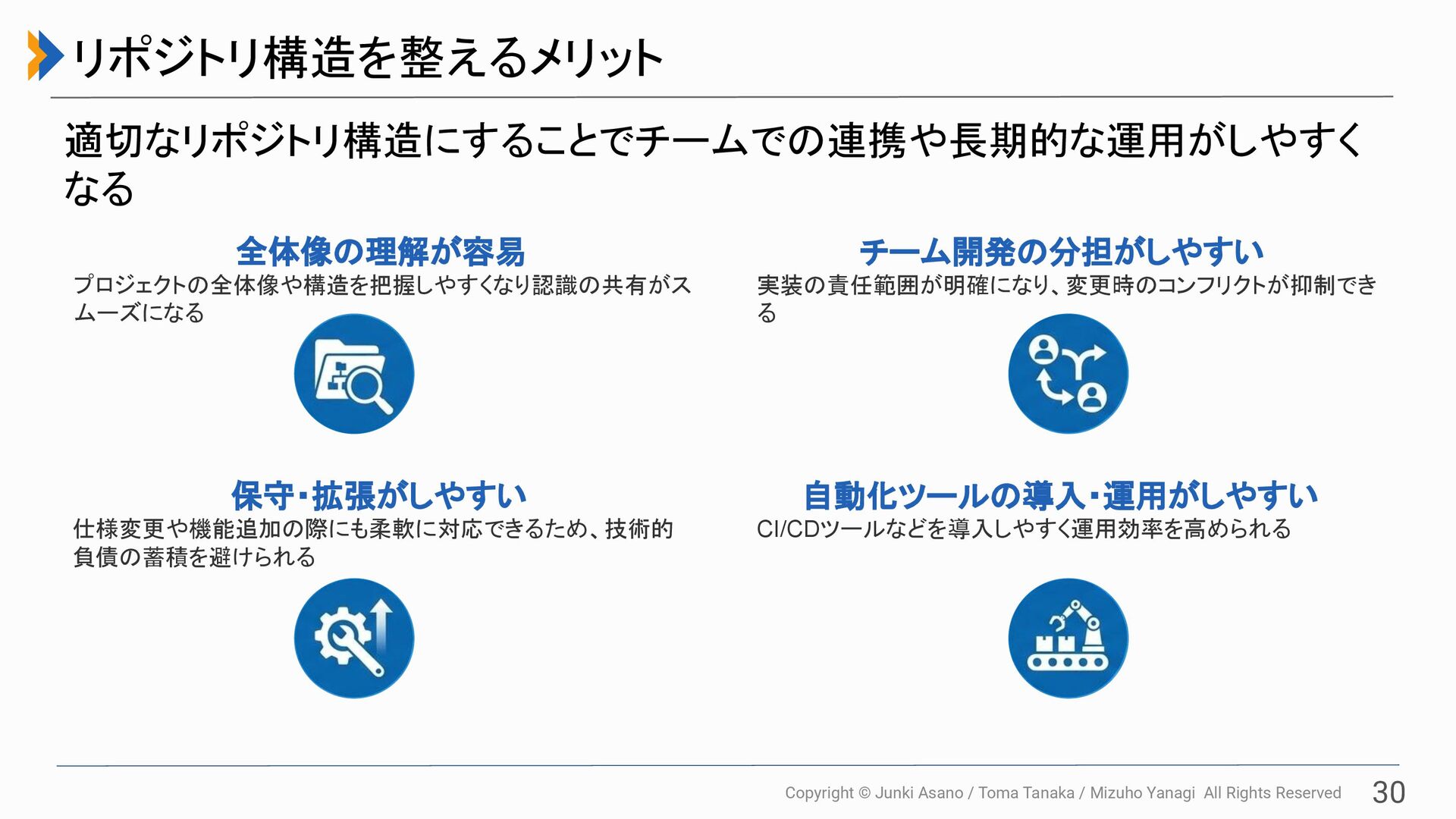 All Rights Reserved 30 リポジトリ構造を整えるメリット 適切なリポジトリ構造にすることでチームでの連携や長期的な運用がしやすく なる 全体像の理解が容易 プロジェクトの全体像や構造を把握しやすくなり認識の共有がス ムーズになる チーム開発の分担がしやすい 実装の責任範囲が明確になり、変更時のコンフリクトが抑制でき る 保守・拡張がしやすい 仕様変更や機能追加の際にも柔軟に対応できるため、技術的 負債の蓄積を避けられる 自動化ツールの導入・運用がしやすい CI/CDツールなどを導入しやすく運用効率を高められる