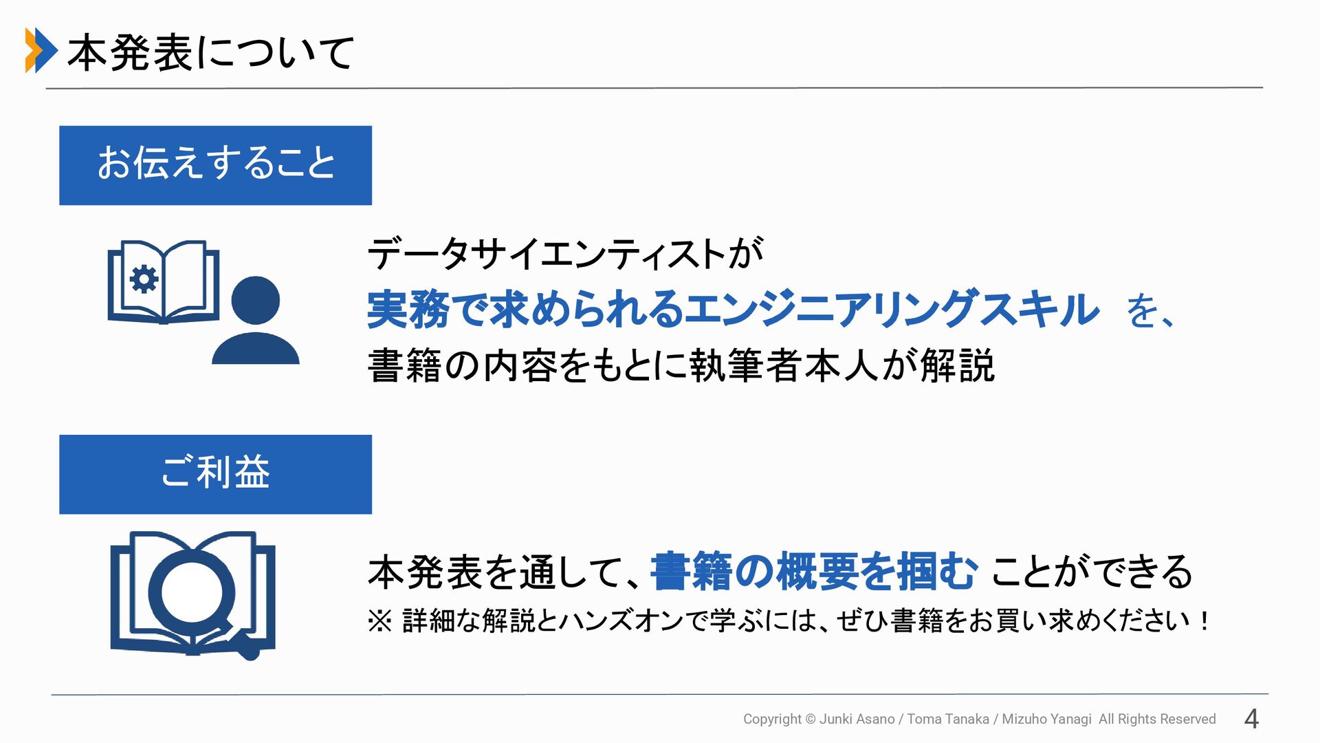 All Rights Reserved 3 自己紹介 浅野 純季(@nash_efp) 株式会社ブレインパッド データサイエンティスト 田中 冬馬(@fuyu_quant) 起業家(?) 栁 泉穂(@suikabar_umai) 株式会社タイミー データサイエンティスト 2019年 2022年 2025年 ブレインパッド に入社 タイミーに入社 LLMアプリケーション 開発など ブレインパッド に入社 ブレインパッド に入社 前職で DSになる プロジェクトマネジメントデータ マネジメント 分析、効果検証など 起業準備と 研究活動