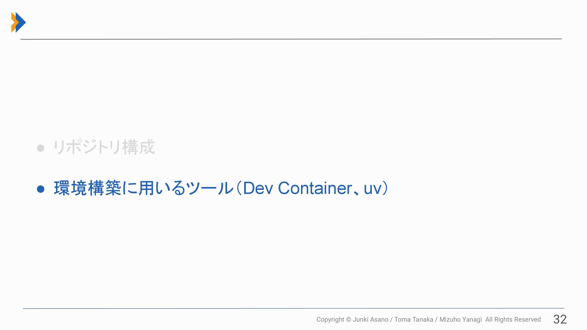 All Rights Reserved 32 • リポジトリ構成 • 環境構築に用いるツール(Dev Container、uv)